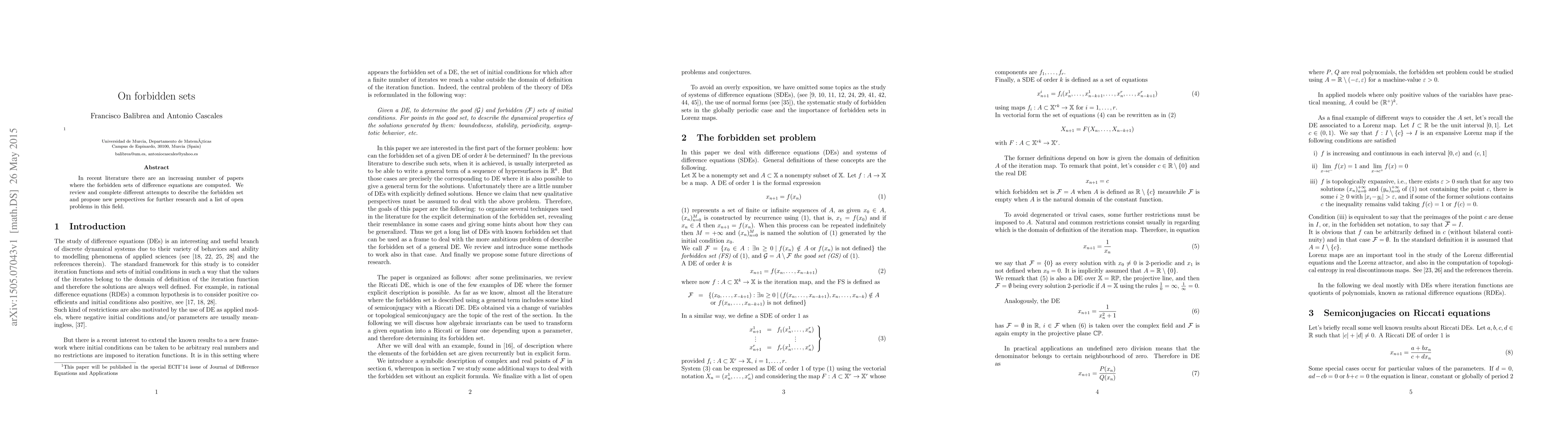 In recent literature there are an increasing number of papers where the forbidden sets of difference equations are computed. We review and complete different attempts to describe the forbidden set and propose new perspectives for further research and a list of open problems in this field.
