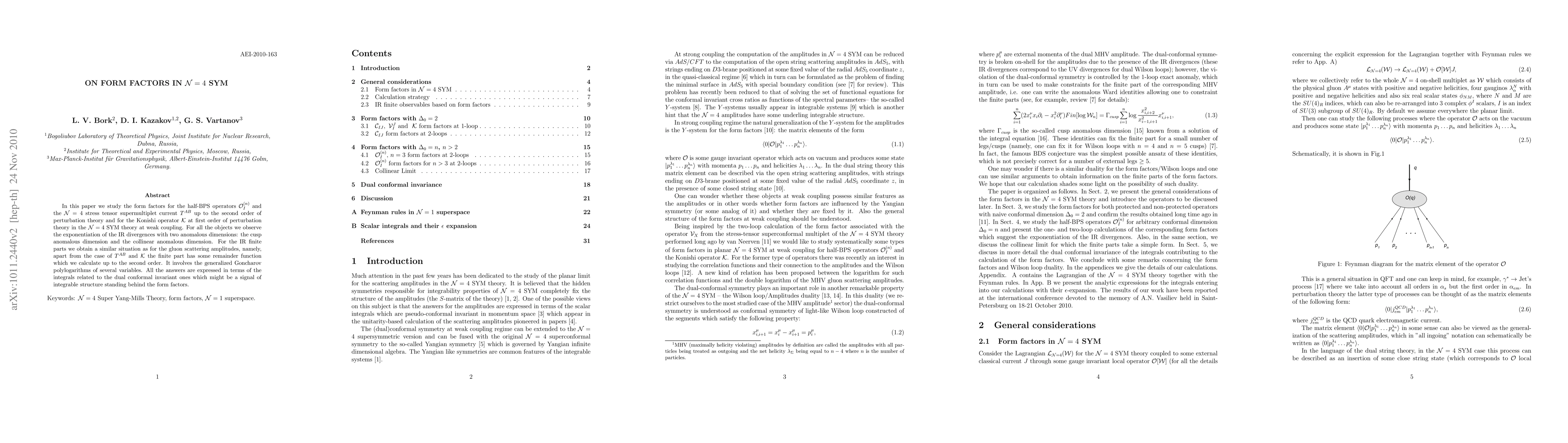 In this paper we study the form factors for the half-BPS operators $\mathcal{O}^{(n)}_I$ and the $\mathcal{N}=4$ stress tensor supermultiplet current $W^{AB}$ up to the second order of perturbation theory and for the Konishi operator $\mathcal{K}$ at first order of perturbation theory in $\mathcal{N}=4$ SYM theory at weak coupling. For all the objects we observe the exponentiation of the IR divergences with two anomalous dimensions: the cusp anomalous dimension and the collinear anomalous dimension. For the IR finite parts we obtain a similar situation as for the gluon scattering amplitudes, namely, apart from the case of $W^{AB}$ and $\mathcal{K}$ the finite part has some remainder function which we calculate up to the second order. It involves the generalized Goncharov polylogarithms of several variables. All the answers are expressed through the integrals related to the dual conformal invariant ones which might be a signal of integrable structure standing behind the form factors.