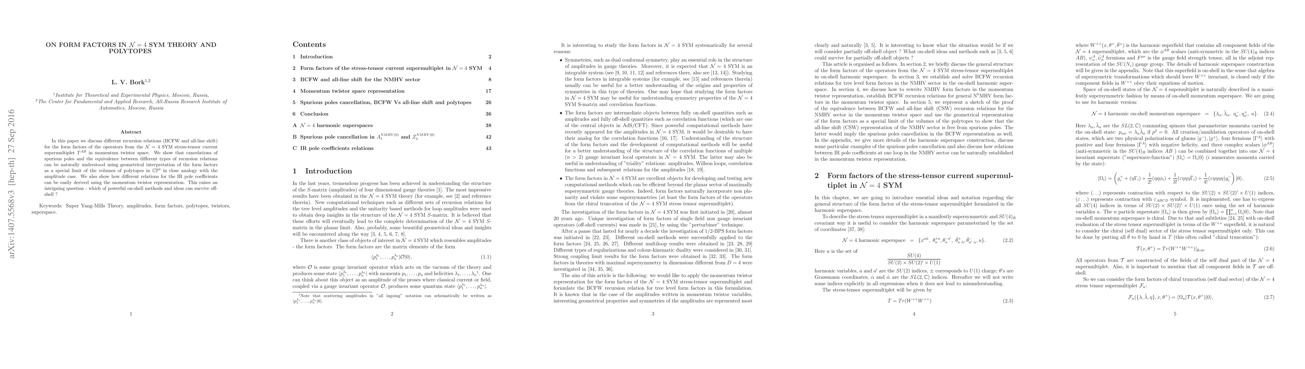 In this paper we discuss different recursion relations (BCFW and all-line shift) for the form factors of the operators from the $\mathcal{N}=4$ SYM stress-tensor current supermultiplet $T^{AB}$ in momentum twistor space. We show that cancelations of spurious poles and equivalence between different types of recursion relations can be naturally understood using geometrical interpretation of the form factors as special limit of the volumes of polytopes in $\mathbb{C}\mathbb{P}^4$ in close analogy with the amplitude case. We also show how different relations for the IR pole coefficients can be easily derived using momentum twistor representation. This opens an intriguing question - which of powerful on-shell methods and ideas can survive off-shell ?