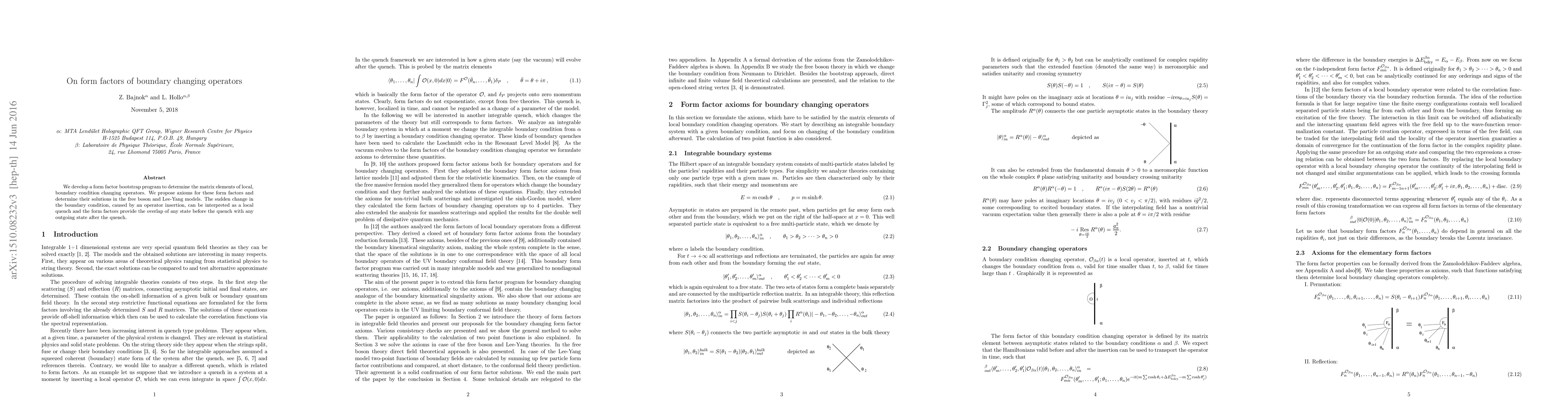 This paper develops a form factor bootstrap program to calculate matrix elements of boundary condition changing operators, proposing axioms and determining solutions in free boson and Lee-Yang models, interpreting operator insertions as local quenches.