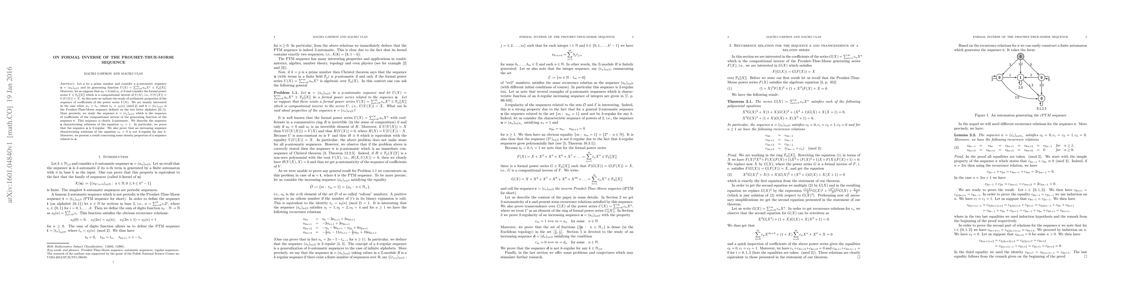 Let $p$ be a prime number and consider a $p$-automatic sequence ${\bf u}=(u_{n})_{n\in\N}$ and its generating function $U(X)=\sum_{n=0}^{\infty}u_{n}X^{n}\in\mathbb{F}_{p}[[X]]$. Moreover, let us suppose that $u_{0}=0$ and $u_{1}\neq 0$ and consider the formal power series $V\in\mathbb{F}_{p}[[X]]$ which is a compositional inverse of $U(X)$, i.e., $U(V(X))=V(U(X))=X$. In this note we initiate the study of arithmetic properties of the sequence of coefficients of the power series $V(X)$. We are mainly interested in the case when $u_{n}=t_{n}$, where $t_{n}=s_{2}(n)\pmod{2}$ and ${\bf t}=(t_{n})_{n\in\N}$ is the Prouhet-Thue-Morse sequence defined on the two letter alphabet $\{0,1\}$. More precisely, we study the sequence ${\bf c}=(c_{n})_{n\in\N}$ which is the sequence of coefficients of the compositional inverse of the generating function of the sequence ${\bf t}$. This sequence is clearly 2-automatic. We describe the sequence ${\bf a}$ characterizing solutions of the equation $c_{n}=1$. In particular, we prove that the sequence ${\bf a}$ is 2-regular. We also prove that an increasing sequence characterizing solutions of the equation $c_{n}=0$ is not $k$-regular for any $k$. Moreover, we present a result concerning some density properties of a sequence related to ${\bf a}$.