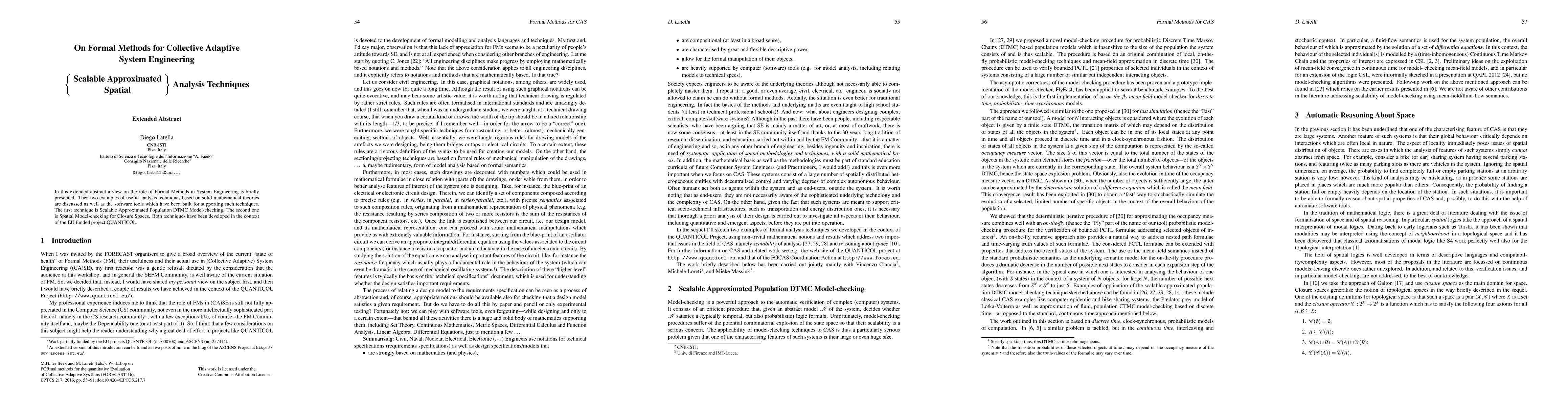 In this extended abstract a view on the role of Formal Methods in System Engineering is briefly presented. Then two examples of useful analysis techniques based on solid mathematical theories are discussed as well as the software tools which have been built for supporting such techniques. The first technique is Scalable Approximated Population DTMC Model-checking. The second one is Spatial Model-checking for Closure Spaces. Both techniques have been developed in the context of the EU funded project QUANTICOL.