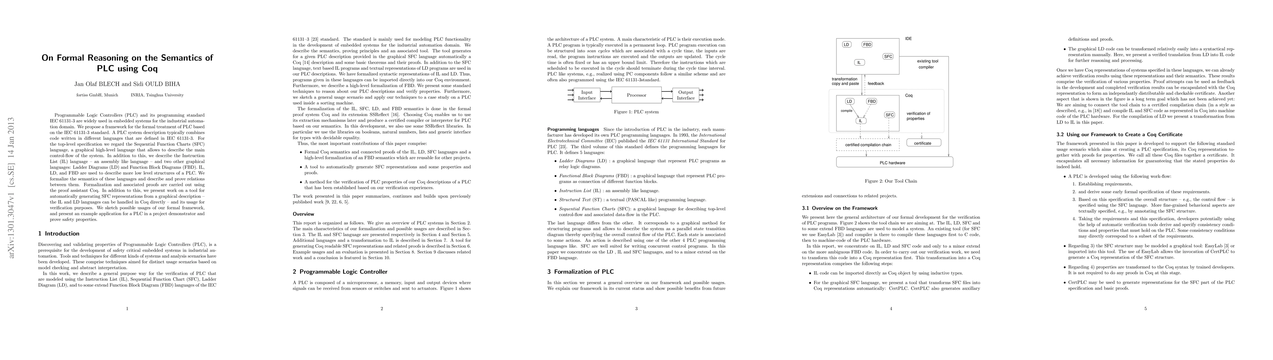 This paper proposes a formal framework for the semantics of Programmable Logic Controllers (PLC) based on the IEC 61131-3 standard, using Coq for formalization and proofs. It includes the formalization of various PLC languages and demonstrates a tool for generating and verifying SFC representations.
