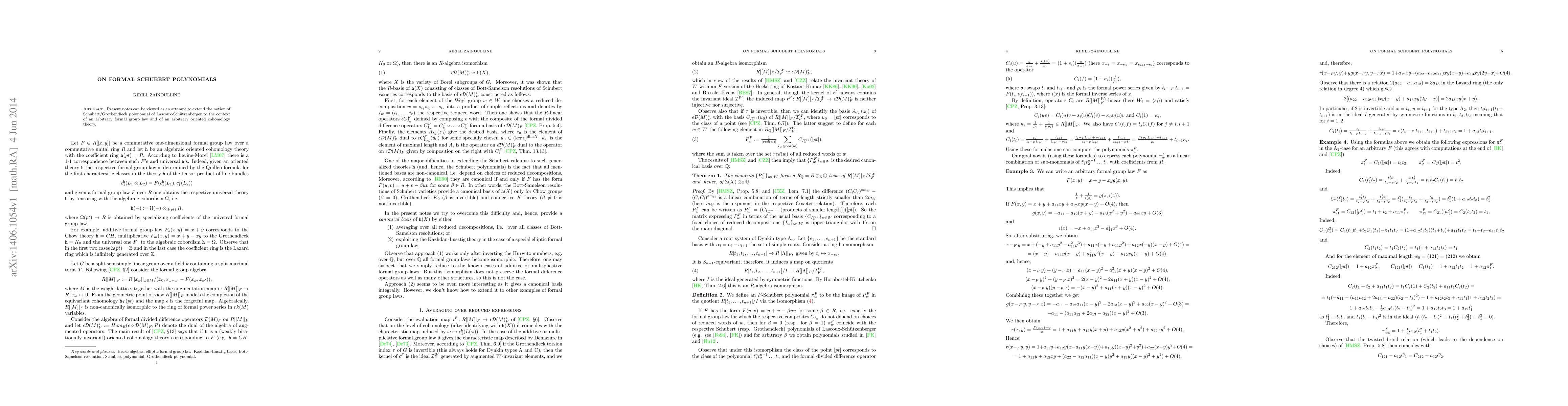 This research paper aims to extend Schubert/Grothendieck polynomials to formal group laws in commutative algebraic cohomology theories. It focuses on a key extension of the notion of these polynomials to arbitrary formal group laws.