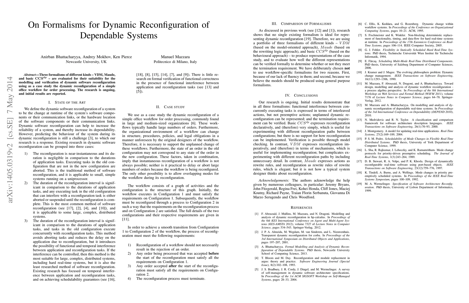 Three formalisms of different kinds - VDM, Maude, and basic CCSdp - are evaluated for their suitability for the modelling and verification of dynamic software reconfiguration using as a case study the dynamic reconfiguration of a simple office workflow for order processing. The research is ongoing, and initial results are reported.