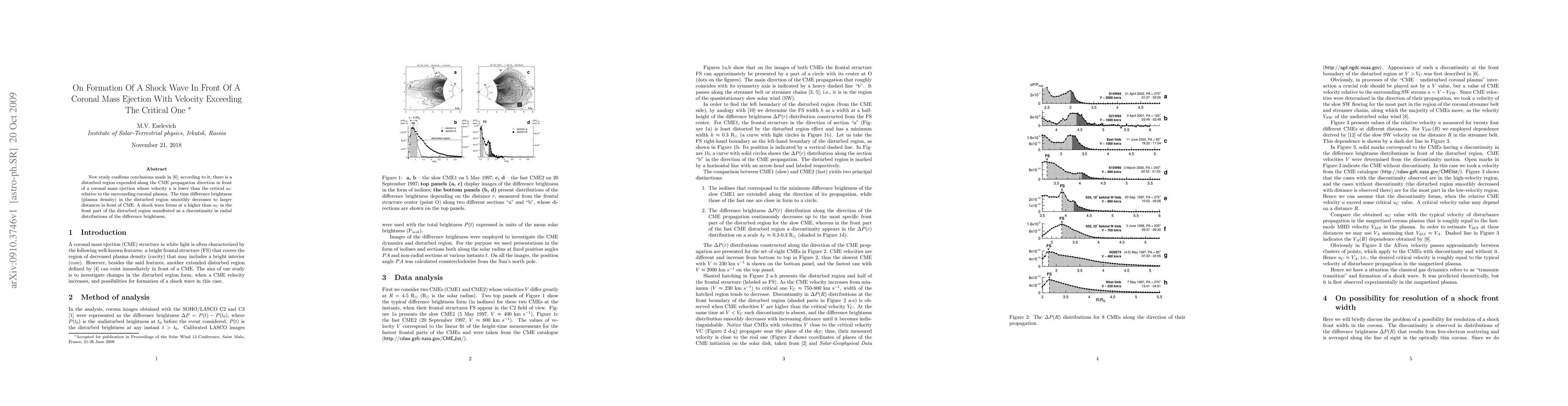 This study confirms that a shock wave forms at coronal mass ejection (CME) velocities exceeding a critical threshold, creating a disturbed region ahead of the CME. The plasma density in this region decreases with distance, and a shock wave manifests as a discontinuity in radial brightness distributions.