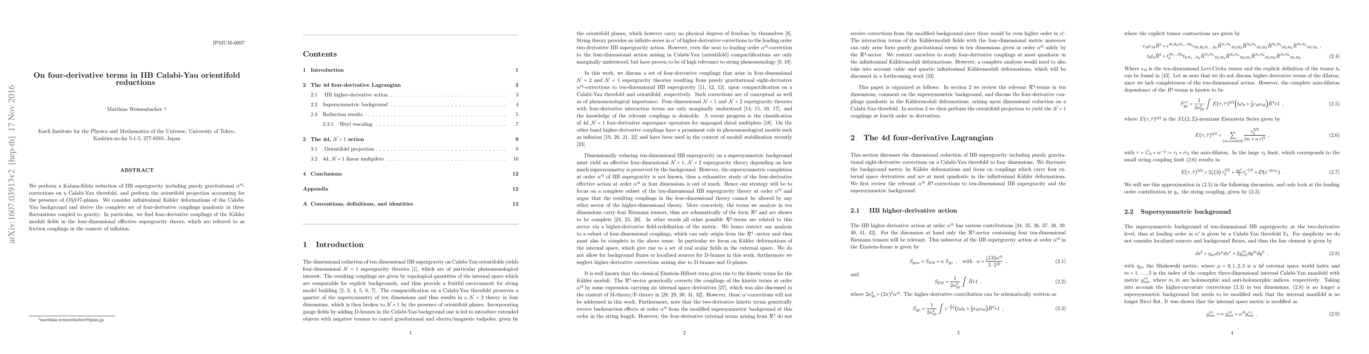 This paper investigates the four-derivative terms in IIB supergravity after a Kaluza-Klein reduction on a Calabi-Yau threefold, considering orientifold projections and $\alpha '^3$-corrections. It derives the complete set of four-derivative couplings quadratic in Kähler deformations, including friction couplings relevant for inflation.