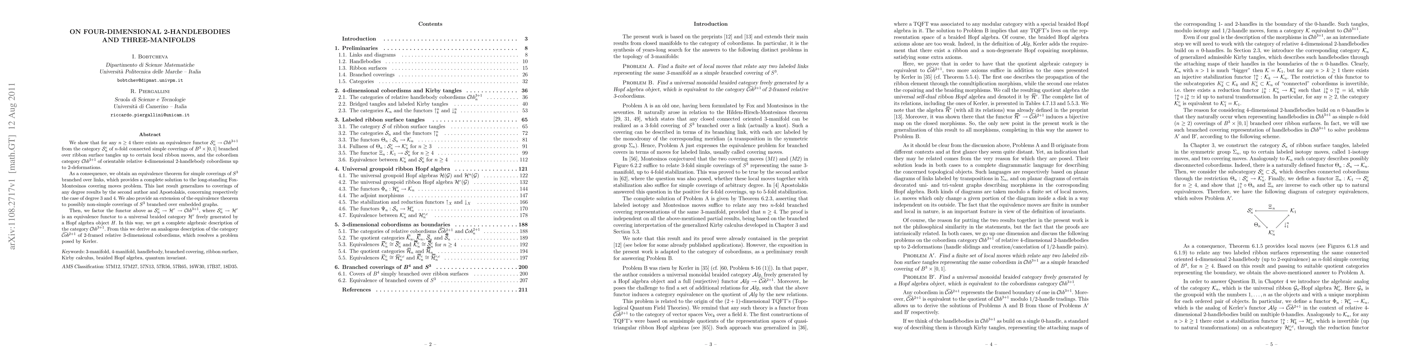 We show that for any n > 3 there exists an equivalence functor from the category of n-fold connected simple coverings of B^3 x [0, 1] branched over ribbon surface tangles up to certain local ribbon moves, to the category Chb^{3+1} of orientable relative 4-dimensional 2-handlebody cobordisms up to 2-deformations. As a consequence, we obtain an equivalence theorem for simple coverings of S^3 branched over links, which provides a complete solution to the long-standing Fox-Montesinos covering moves problem. This last result generalizes to coverings of any degree results by the second author and Apostolakis, concerning respectively the case of degree 3 and 4. We also provide an extension of the equivalence theorem to possibly non-simple coverings of S^3 branched over embedded graphs. Then, we factor the functor above through an equivalence functor from H^r to Chb^{3+1}, where H^r is a universal braided category freely generated by a Hopf algebra object H. In this way, we get a complete algebraic description of the category Chb^{3+1}. From this we derive an analogous description of the category Cob^{2+1} of 2-framed relative 3-dimensional cobordisms, which resolves a problem posed by Kerler.