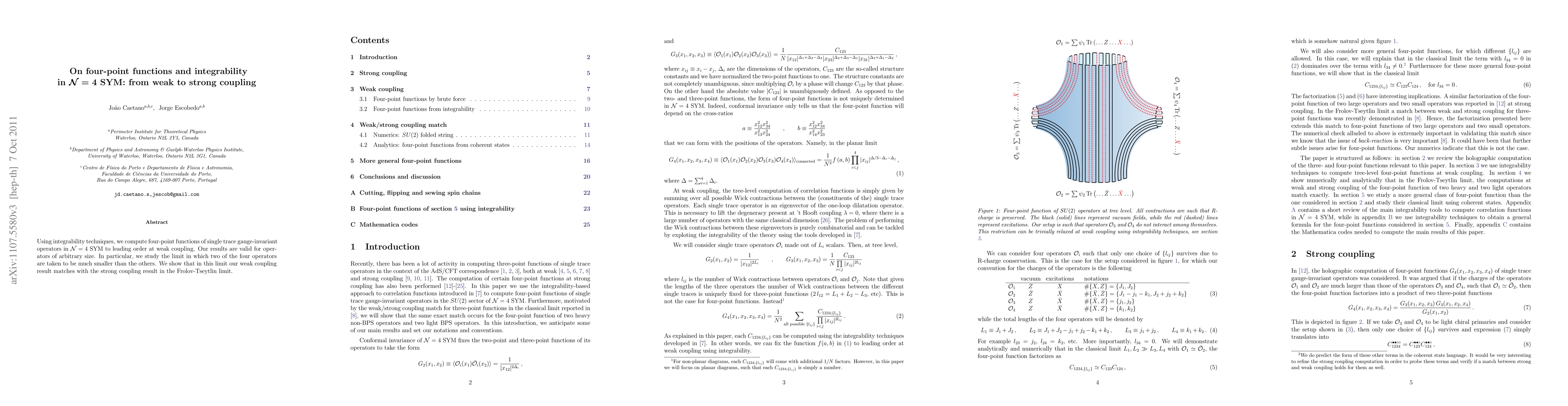 This paper employs integrability techniques to calculate four-point functions of single trace gauge-invariant operators in N=4 SYM at weak coupling, valid for operators of any size. It demonstrates the matching of weak and strong coupling results in the Frolov-Tseytlin limit when two operators are much smaller than the others.