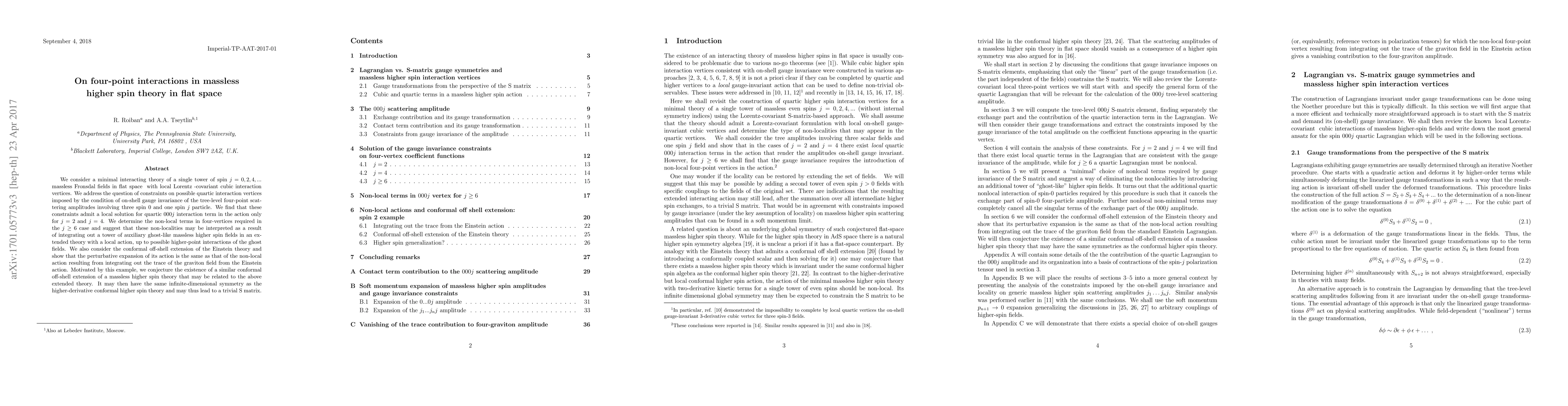 We consider the minimal interacting theory of a single tower of spin j=0,2,4,... massless Fronsdal fields in flat space for which consistent covariant cubic interaction vertices are known. We address the question of constraints on possible quartic interaction vertices imposed by the condition of on-shell gauge invariance of the tree-level four-point scattering amplitudes involving three spin 0 and one spin j particle. We find that these constraints admit a local solution for quartic 000j interaction term in the action only for j=2 and j=4. We determine the non-local terms in four-vertices required in the case of spin j greater than 4 and show that these non-localities can be interpreted as a result of integrating out a tower of auxiliary ghost-like massless higher spin fields in an extended theory with a local action. We also consider the conformal off-shell extension of the Einstein theory and show that its perturbative expansion is the same as of the the non-local action resulting from integrating out the trace of the graviton field from the Einstein action. Motivated by this example, we conjecture the existence of a similar conformal off-shell extension of a massless higher spin theory that may be related to the above extended theory and may have the same infinite-dimensional symmetry as the conformal higher spin theory and thus may lead to a trivial S matrix.