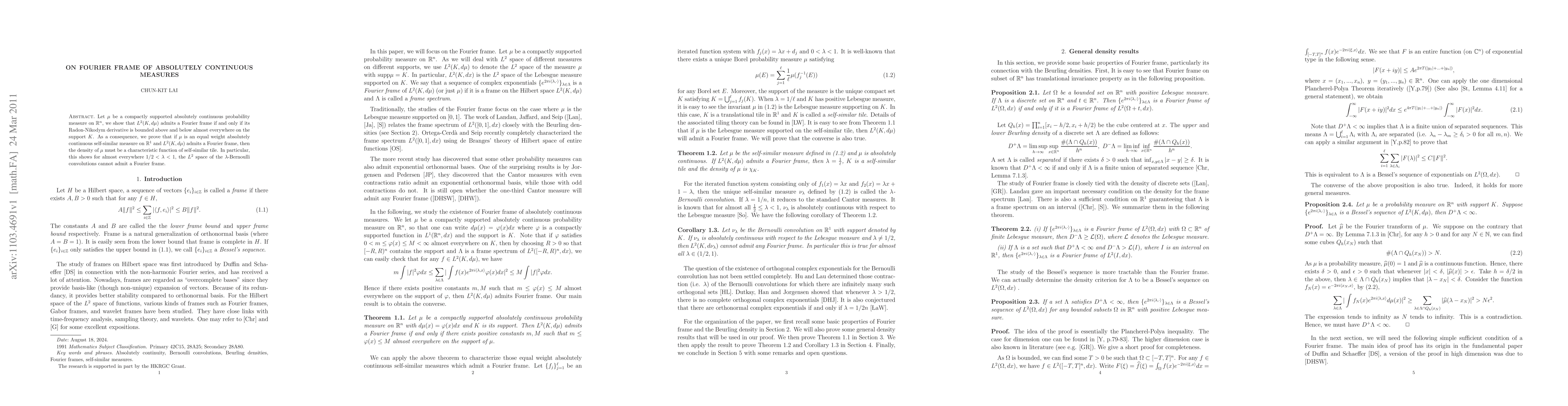 Let $\mu$ be a compactly supported absolutely continuous probability measure on ${\Bbb R}^n$, we show that $\mu$ admits Fourier frames if and only if its Radon-Nikodym derivative is upper and lower bounded almost everywhere on its support. As a consequence, we prove that if an equal weight absolutely continuous self-similar measure on ${\Bbb R}^1$ admits Fourier frame, then the measure must be a characteristic function of self-similar tile. In particular, this shows for almost everywhere $1/2<\lambda<1$, the $\lambda$-Bernoulli convolutions cannot admit Fourier frames.