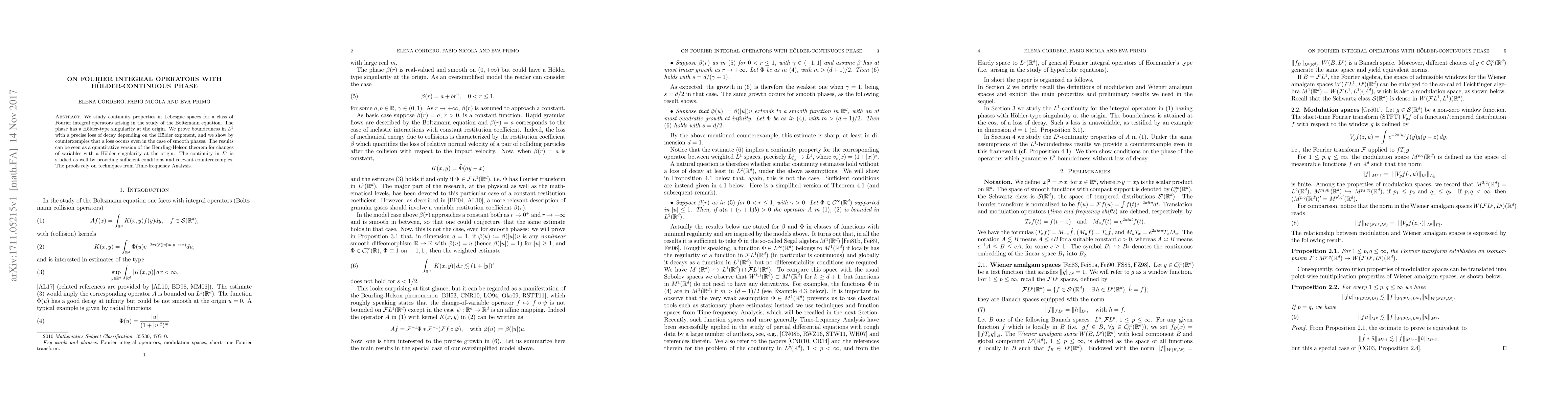 We study continuity properties in Lebesgue spaces for a class of Fourier integral operators arising in the study of the Boltzmann equation. The phase has a H\"older-type singularity at the origin. We prove boundedness in $L^1$ with a precise loss of decay depending on the H\"older exponent, and we show by counterexamples that a loss occurs even in the case of smooth phases. The results can be seen as a quantitative version of the Beurling-Helson theorem for changes of variables with a H\"older singularity at the origin. The continuity in $L^2$ is studied as well by providing sufficient conditions and relevant counterexamples. The proofs rely on techniques from Time-frequency Analysis.