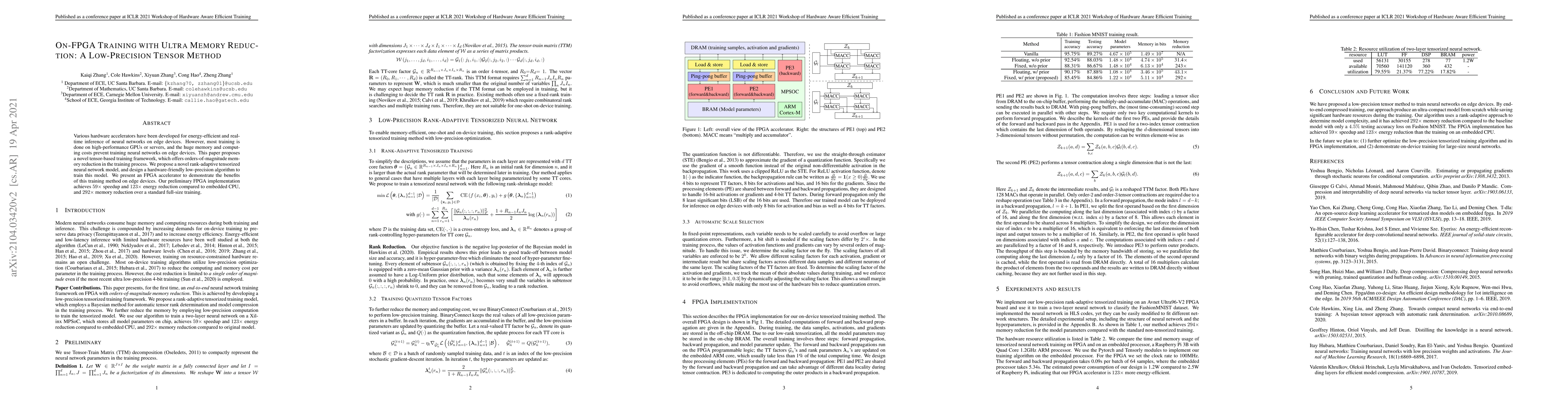 Various hardware accelerators have been developed for energy-efficient and real-time inference of neural networks on edge devices. However, most training is done on high-performance GPUs or servers, and the huge memory and computing costs prevent training neural networks on edge devices. This paper proposes a novel tensor-based training framework, which offers orders-of-magnitude memory reduction in the training process. We propose a novel rank-adaptive tensorized neural network model, and design a hardware-friendly low-precision algorithm to train this model. We present an FPGA accelerator to demonstrate the benefits of this training method on edge devices. Our preliminary FPGA implementation achieves $59\times$ speedup and $123\times$ energy reduction compared to embedded CPU, and $292\times$ memory reduction over a standard full-size training.
