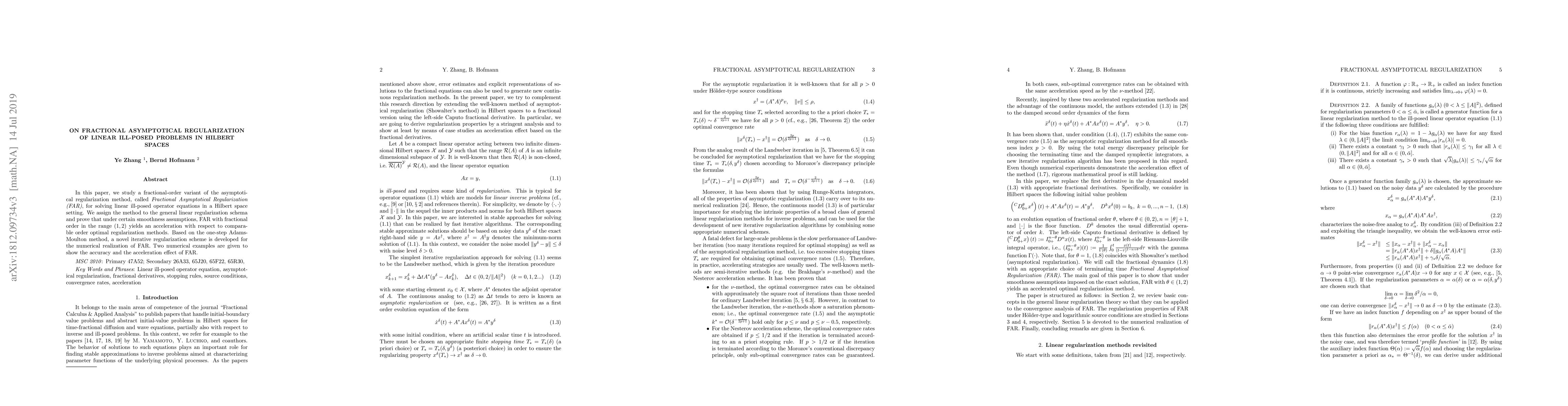 This paper introduces Fractional Asymptotical Regularization (FAR) for solving linear ill-posed operator equations in Hilbert spaces, demonstrating that FAR with fractional orders in the range (1,2) provides superior convergence compared to traditional methods. An iterative scheme based on the Adams-Moulton method is developed for numerical implementation, and numerical examples validate the method's accuracy and acceleration benefits.