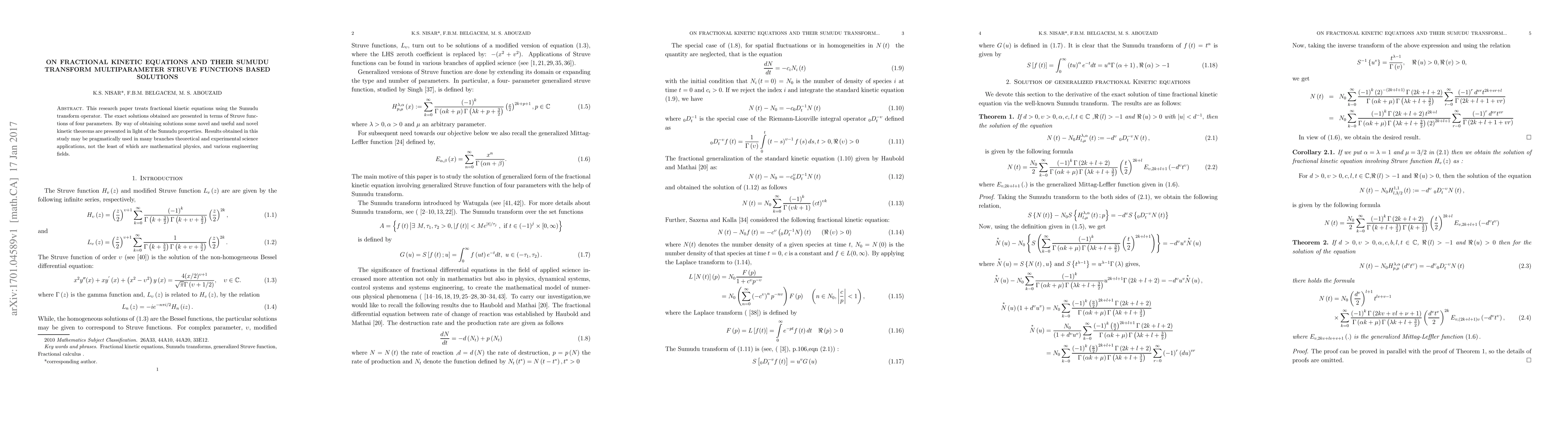 This research paper treats fractional kinetic equations using the Sumudu transform operator. The exact solutions obtained are presented in terms of Struve functions of four parameters. By way of obtaining solutions some novel and useful and novel kinetic theorems are presented in light of the Sumudu properties. Results obtained in this study may be pragmatically used in many branches theoretical and experimental science applications, not the least of which are mathematical physics, and various engineering fields.