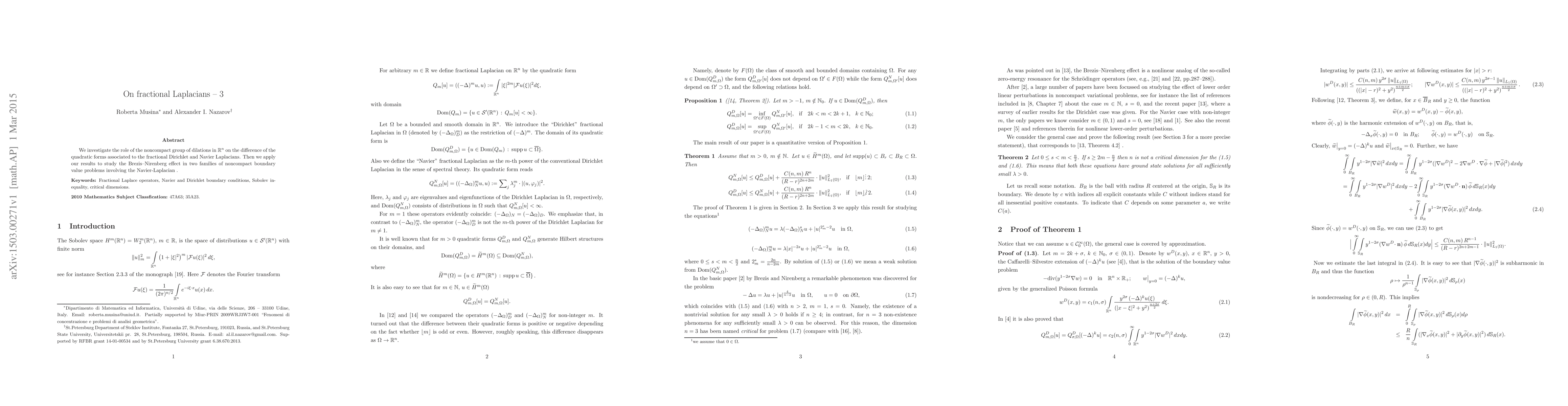 We investigate the role of the noncompact group of dilations in $\mathbb R^n$ on the difference of the quadratic forms associated to the fractional Dirichlet and Navier Laplacians. Then we apply our results to study the Brezis--Nirenberg effect in two families of noncompact boundary value problems involving the Navier-Laplacian.