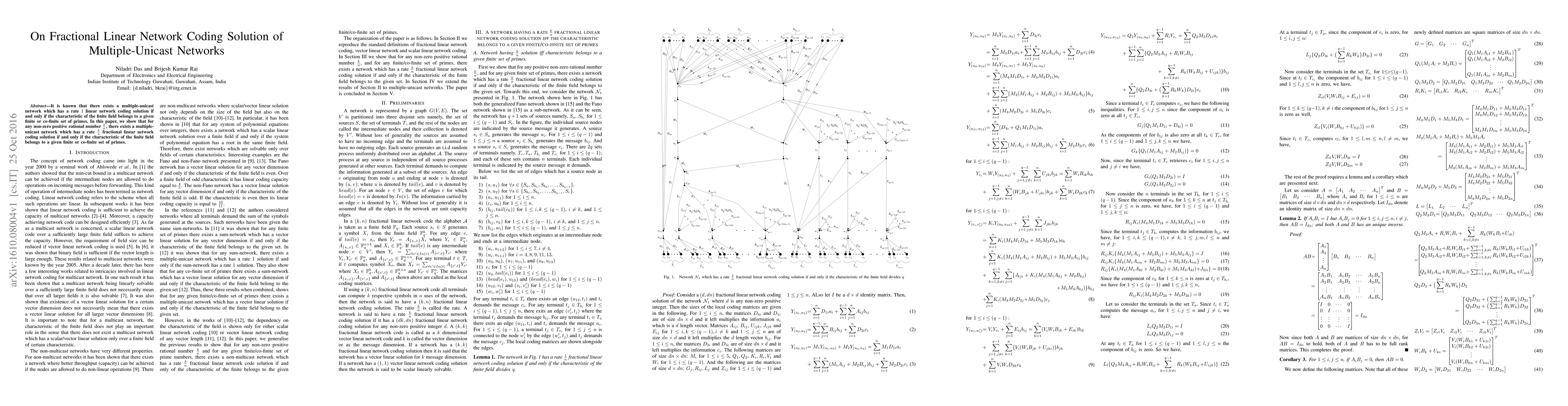 The paper presents a detailed analysis of fractional linear network coding solutions for multiple-unicast networks, extending previous work by demonstrating the existence of rate $rac{k}{n}$ solutions for any non-zero positive rational number $rac{k}{n}$ under specific conditions on the finite field characteristic.