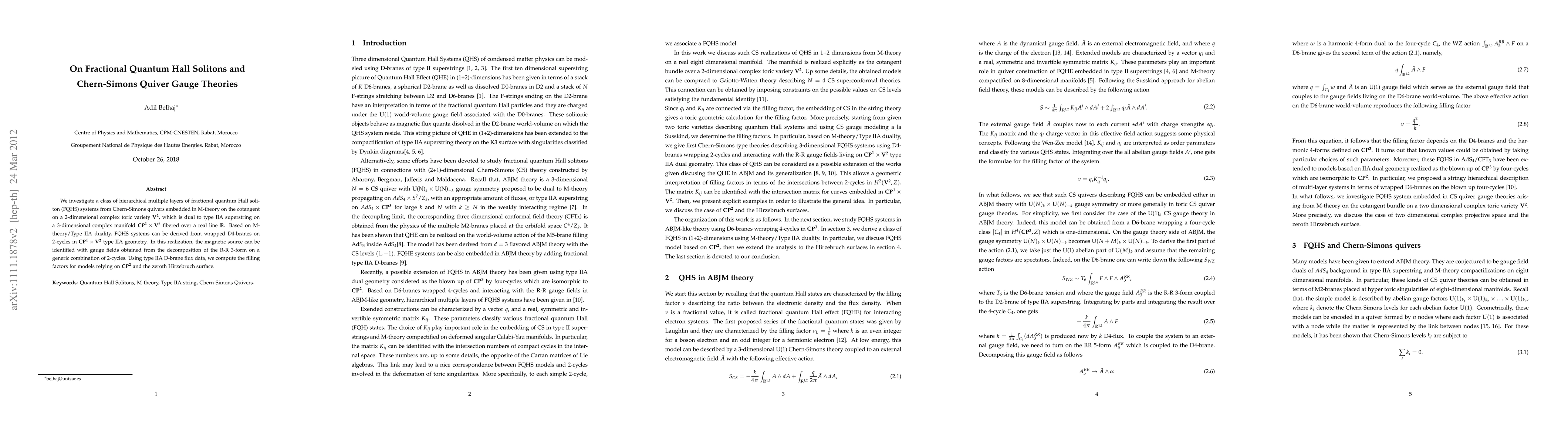We investigate a class of hierarchical multiple layers of fractional quantum Hall soliton (FQHS) systems from Chern-Simons quivers embedded in M-theory on the cotangent on a 2-dimensional complex toric variety \bf V^2, which is dual to type IIA superstring on a 3-dimensional complex manifold \bf {CP}^1\times V^2 fibered over a real line \mathbb{R}. Based on M-theory/Type IIA duality, FQHS systems can be derived from wrapped D4-branes on 2-cycles in \bf {CP}^1\times V^2 type IIA geometry. In this realization, the magnetic source can be identified with gauge fields obtained from the decomposition of the R-R 3-form on a generic combination of 2-cycles. Using type IIA D-brane flux data, we compute the filling factors for models relying on \bf{CP}^2 and the zeroth Hirzebruch surface.