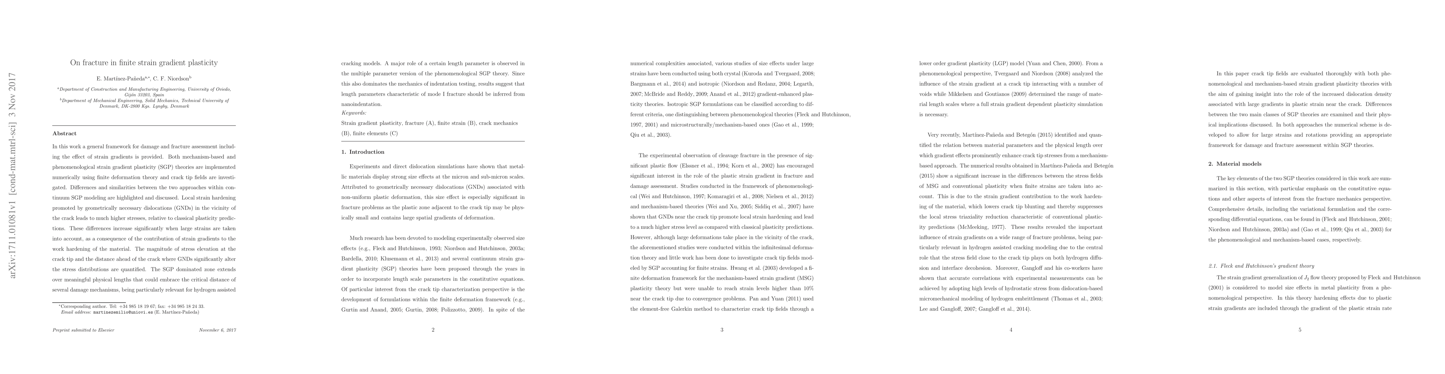 This paper develops a framework for assessing damage and fracture in finite strain gradient plasticity, comparing mechanism-based and phenomenological theories. It finds that strain gradients significantly elevate stresses near cracks, especially under large strains, and identifies the relevance of length parameters in fracture mechanics, suggesting nanoindentation as a method to infer these parameters.
