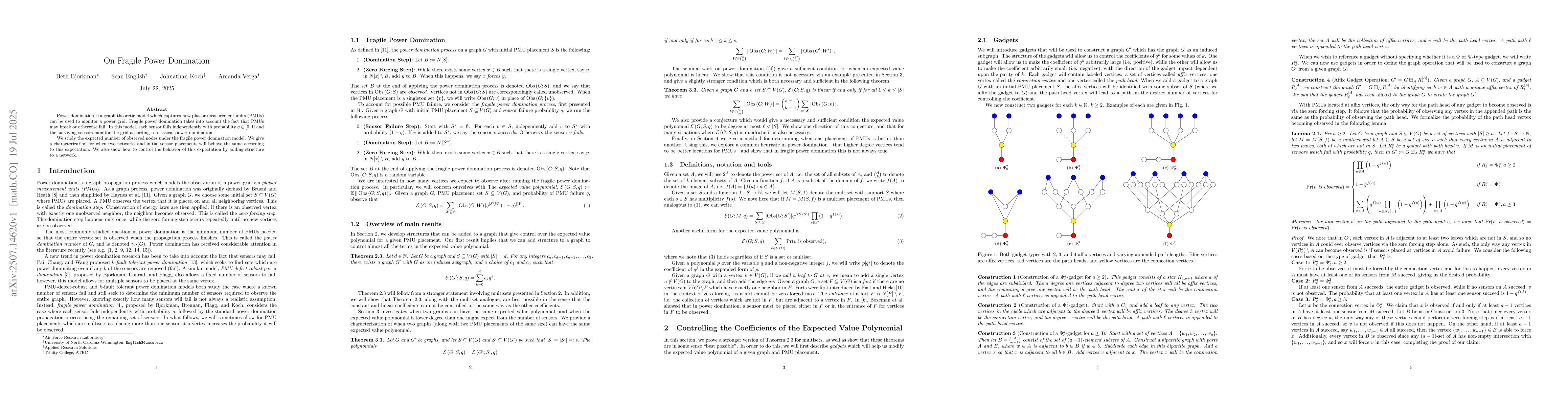 Power domination is a graph theoretic model which captures how phasor measurement units (PMUs) can be used to monitor a power grid. Fragile power domination takes into account the fact that PMUs may break or otherwise fail. In this model, each sensor fails independently with probability $q\in [0,1]$ and the surviving sensors monitor the grid according to classical power domination. We study the expected number of observed nodes under the fragile power domination model. We give a characterization for when two networks and initial sensor placements will behave the same according to this expectation. We also show how to control the behavior of this expectation by adding structure to a network.