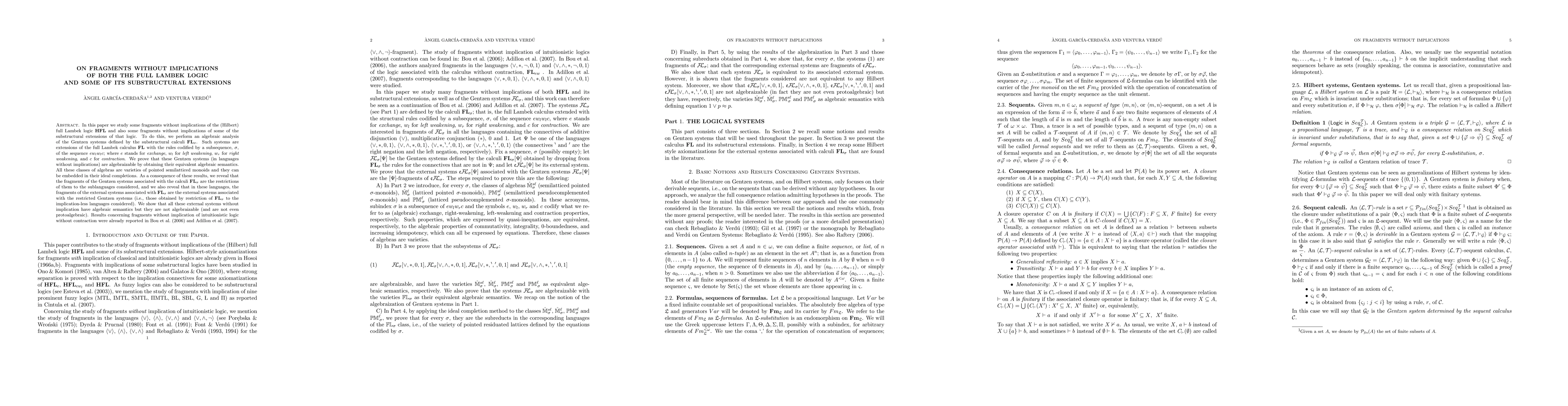 This paper investigates fragments without implications of the full Lambek logic and its substructural extensions, performing an algebraic analysis of their Gentzen systems. It demonstrates that these fragments are algebraizable and reveals that their algebraic semantics are varieties of pointed semilatticed monoids.