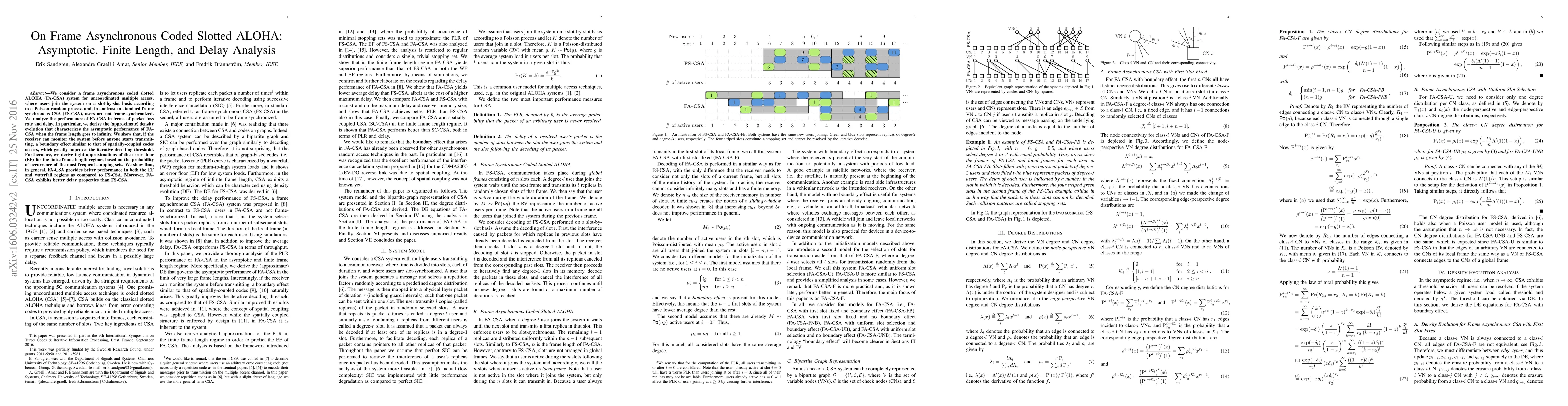 This paper analyzes a frame asynchronous coded slotted ALOHA system, demonstrating improved performance over frame synchronous systems in terms of packet loss rate, error floor, and delay. It shows that FA-CSA benefits from a boundary effect enhancing decoding thresholds and provides better overall performance compared to FS-CSA.
