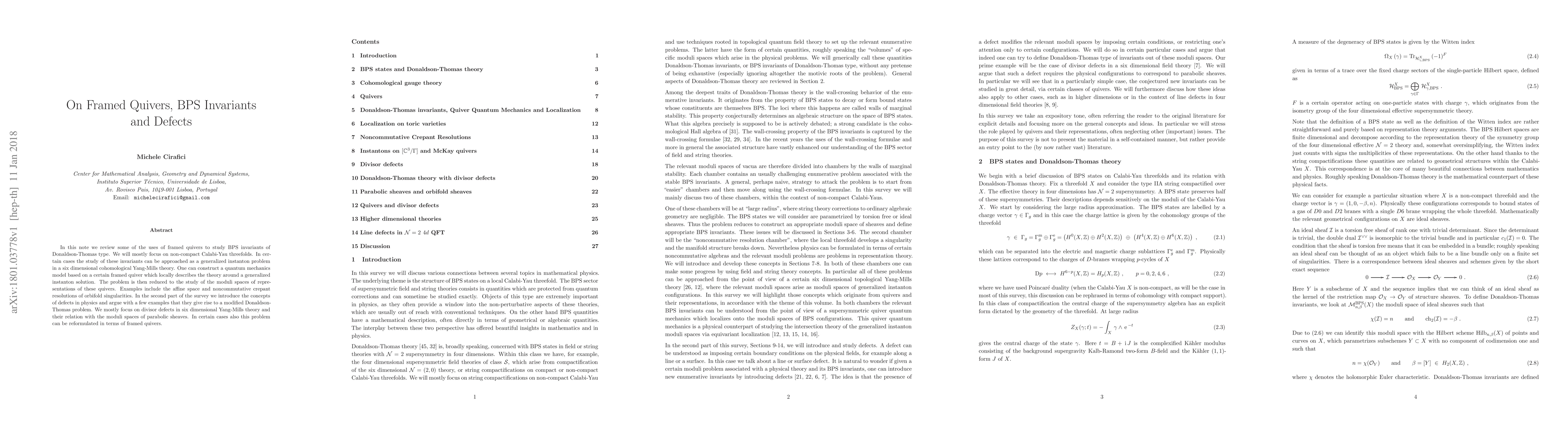 In this note we review some of the uses of framed quivers to study BPS invariants of Donaldson-Thomas type. We will mostly focus on non-compact Calabi-Yau threefolds. In certain cases the study of these invariants can be approached as a generalized instanton problem in a six dimensional cohomological Yang-Mills theory. One can construct a quantum mechanics model based on a certain framed quiver which locally describes the theory around a generalized instanton solution. The problem is then reduced to the study of the moduli spaces of representations of these quivers. Examples include the affine space and noncommutative crepant resolutions of orbifold singularities. In the second part of the survey we introduce the concepts of defects in physics and argue with a few examples that they give rise to a modified Donaldson-Thomas problem. We mostly focus on divisor defects in six dimensional Yang-Mills theory and their relation with the moduli spaces of parabolic sheaves. In certain cases also this problem can be reformulated in terms of framed quivers.