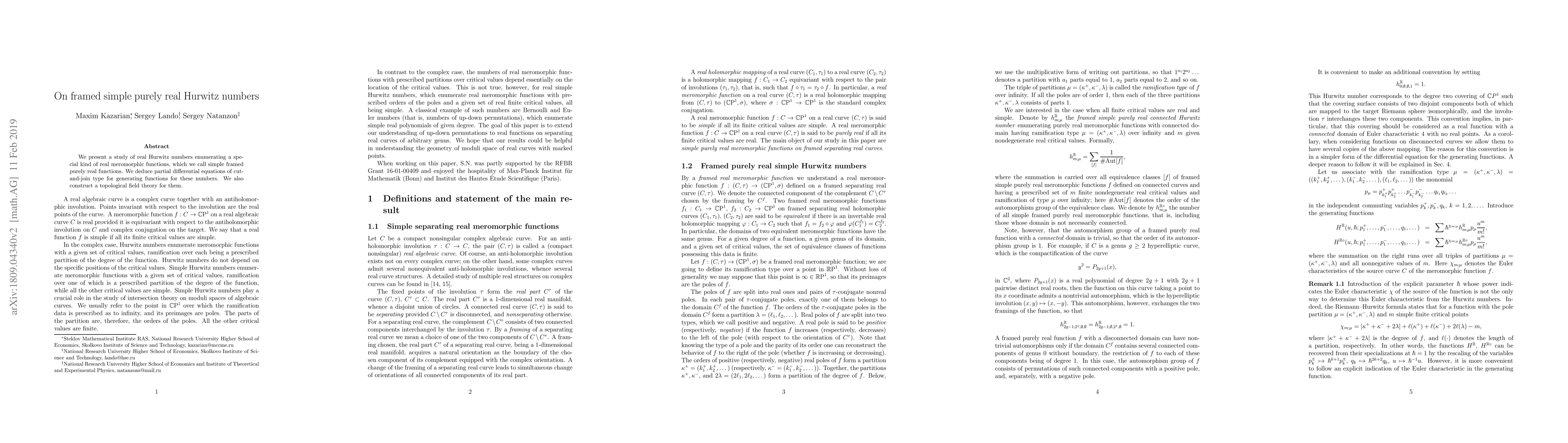 We present a study of real Hurwitz numbers enumerating a special kind of real meromorphic functions, which we call simple framed purely real functions. We deduce partial differential equations of cut-and-join type for generating functions for these numbers. We also construct a topological field theory for them.