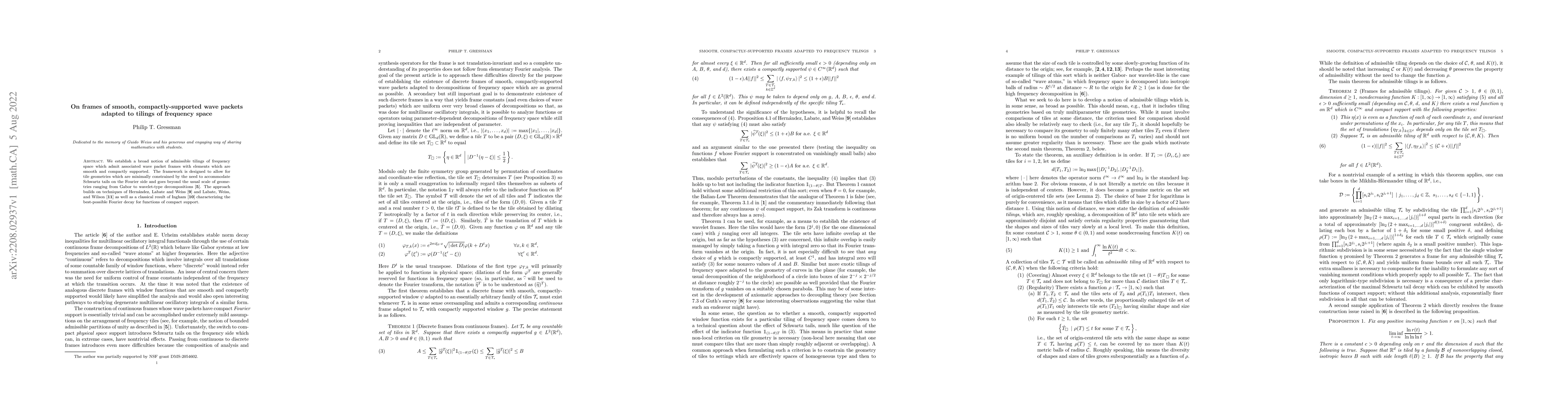 We establish a broad notion of admissible tilings of frequency space which admit associated wave packet frames with elements which are smooth and compactly supported. The framework is designed to allow for tile geometries which are minimally constrained by the need to accommodate Schwartz tails on the Fourier side and goes beyond the usual scale of geometries ranging from Gabor to wavelet-type decompositions. The approach builds on techniques of Hern\'{a}ndez, Labate and Weiss and Labate, Weiss, and Wilson as well as a classical result of Ingham characterizing the best-possible Fourier decay for functions of compact support.