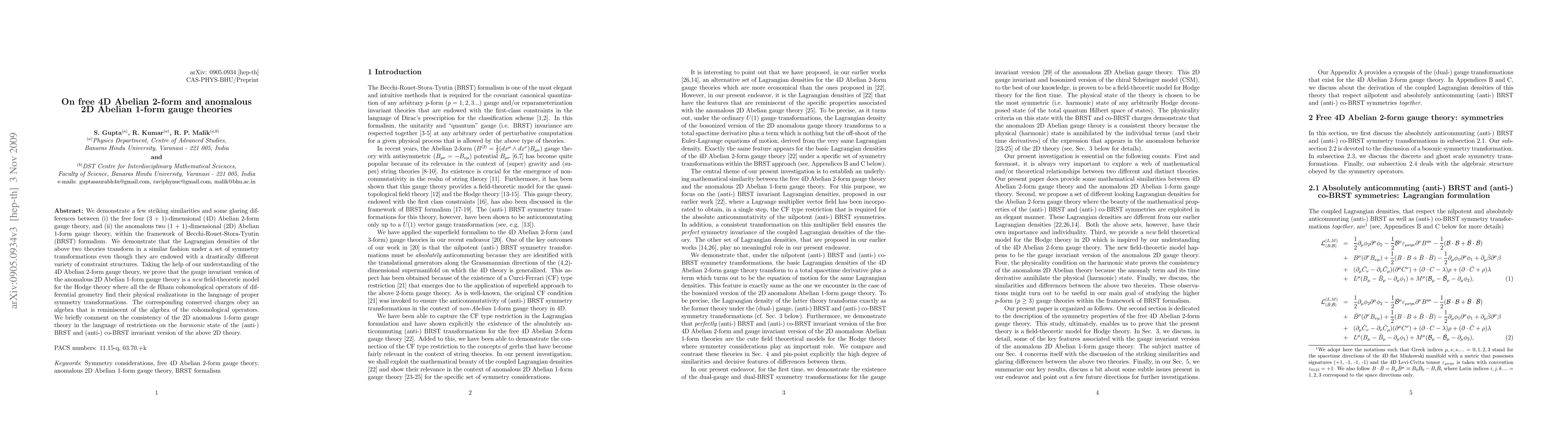 This paper explores similarities and differences between free 4D Abelian 2-form gauge theory and anomalous 2D Abelian 1-form gauge theory using BRST formalism, revealing that their Lagrangian densities transform similarly despite distinct constraint structures. It proposes a new field-theoretic model for Hodge theory based on the 2D anomalous gauge theory, aligning conserved charges with cohomological operators.