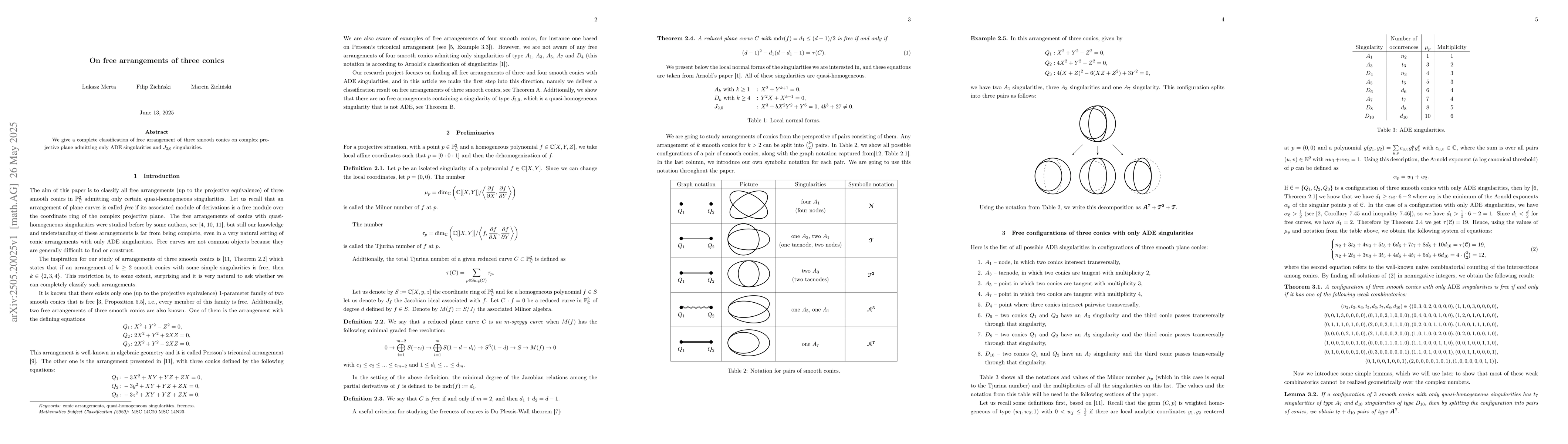 The research employs algebraic geometry techniques to classify free arrangements of three smooth conics on the complex projective plane, focusing on singularities classified as ${ m ADE}$ and $J_{2,0}$.