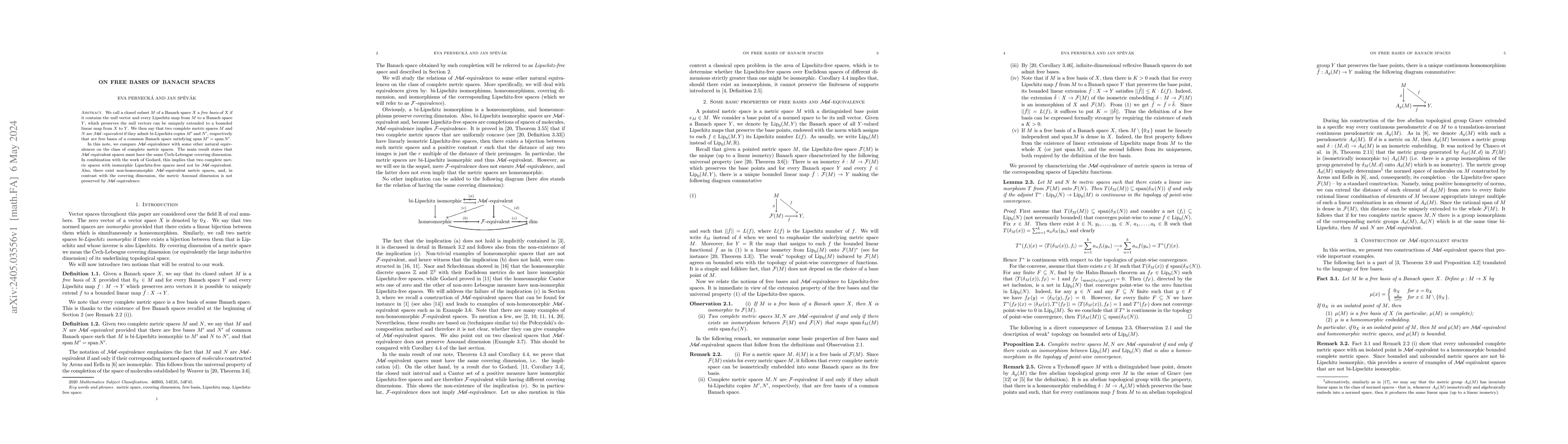 This paper investigates the concept of free bases in Banach spaces and introduces Mol-equivalence between complete metric spaces based on their Lipschitz-free properties. The main result demonstrates that Mol-equivalent spaces share the same \v{C}ech-Lebesgue covering dimension, contrasting with the non-preservation of the Assouad metric dimension under Mol-equivalence.