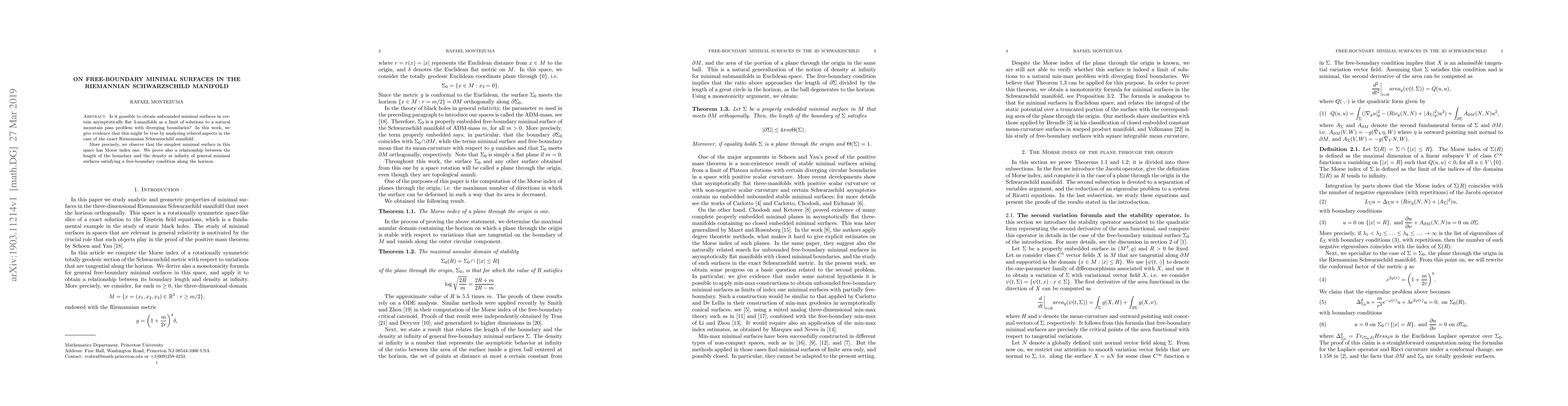 Is it possible to obtain unbounded minimal surfaces in certain asymptotically flat 3-manifolds as a limit of solutions to a natural mountain pass problem with diverging boundaries? In this work, we give evidence that this might be true by analyzing related aspects in the case of the exact Riemannian Schwarzschild manifold. More precisely, we observe that the simplest minimal surface in this space has Morse index one. We prove also a relationship between the length of the boundary and the density at infinity of general minimal surfaces satisfying a free-boundary condition along the horizon.