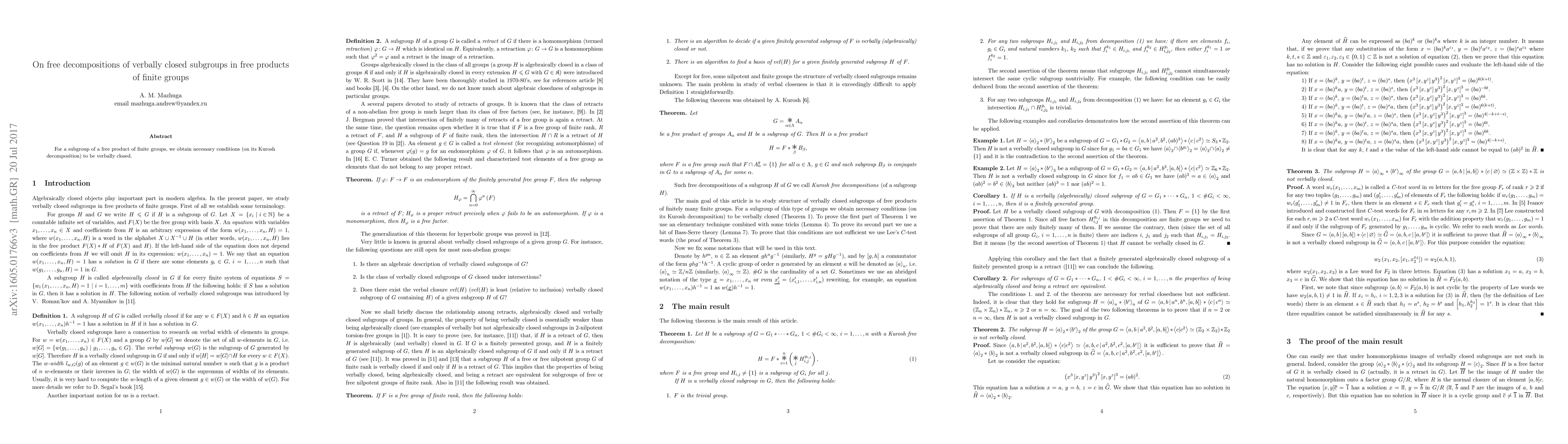 Summary: This paper investigates the necessary conditions for a subgroup of a free product of finite groups to be verbally closed, focusing on its Kurosh decomposition. The findings provide insights into the structure of such subgroups.