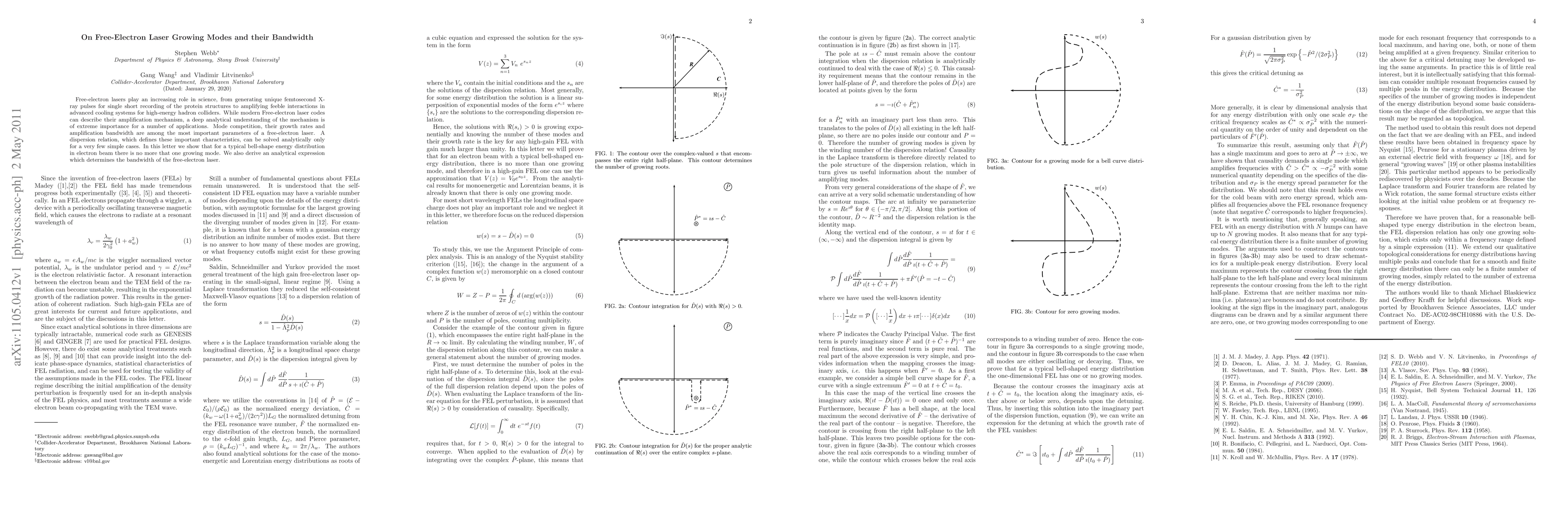 This paper investigates the growing modes and bandwidth of free-electron lasers, demonstrating that for a typical bell-shaped electron beam energy distribution, only one growing mode exists. It also provides an analytical expression to determine the laser's amplification bandwidth.
