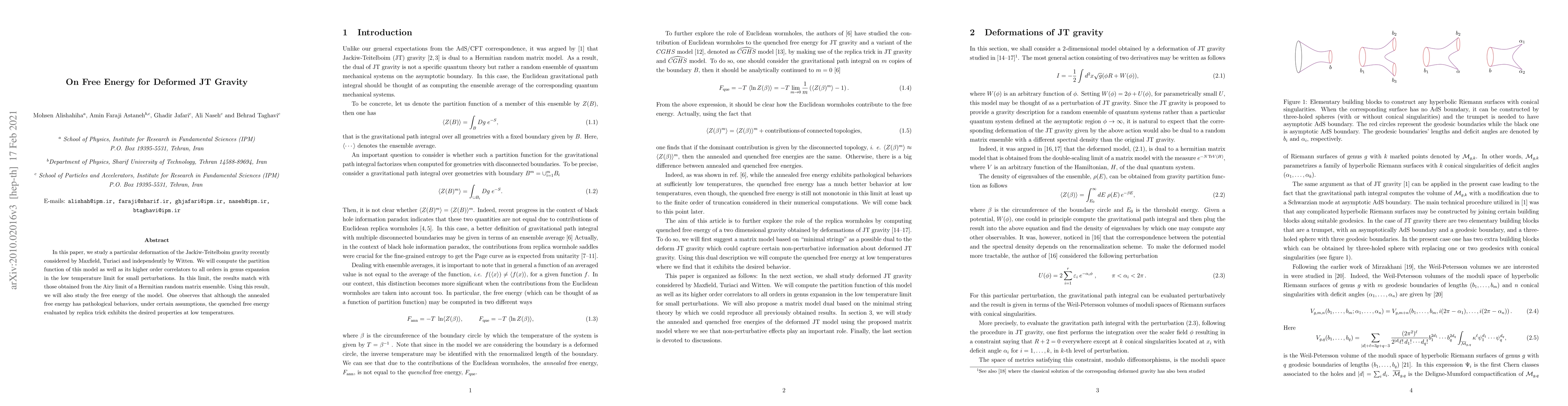 In this paper, we study a particular deformation of the Jackiw-Teitelboim gravity recently considered by Maxfield, Turiaci and independently by Witten. We will compute the partition function of this model as well as its higher order correlators to all orders in genus expansion in the low temperature limit for small perturbations. In this limit, the results match with those obtained from the Airy limit of a Hermitian random matrix ensemble. Using this result, we will also study the free energy of the model. One observes that although the annealed free energy has pathological behaviors, under certain assumptions, the quenched free energy evaluated by replica trick exhibits the desired properties at low temperatures.