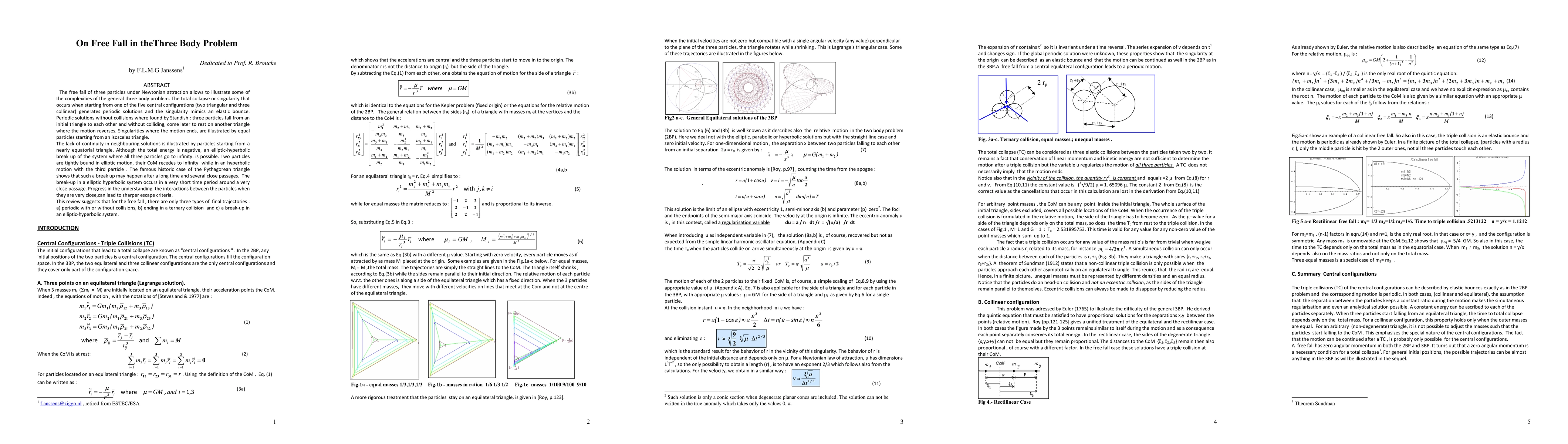 The free fall of three particles under Newtonian attraction allows to illustrate some of the complexities of the general three body problem. The total collapse or singularity that occurs when starting from one of the five central configurations (two triangular and three collinear) generates periodic solutions and the singularity mimics an elastic bounce. Periodic solutions without collisions where found by Standish : three particles fall from an initial triangle to each other and without colliding, come later to rest on another triangle where the motion reverses. Singularities where the motion ends, are illustrated by equal particles starting from an isosceles triangle. The lack of continuity in neighbouring solutions is illustrated by particles starting from a nearly equatorial triangle. Although the total energy is negative, an elliptic-hyperbolic break up of the system where all three particles go to infinity. is possible. Two particles are tightly bound in elliptic motion, their CoM recedes to infinity while in an hyperbolic motion with the third particle. The famous historic case of the Pythagorean triangle shows that such a break up may happen after a long time and several close passages. The break-up in a elliptic hyperbolic system occurs in a very short time period around a very close passage. Progress in the understanding the interactions between the particles when they are very close,can lead to sharper escape criteria. This review suggests that for the free fall, there are only three types of final trajectories : a) periodic with or without collisions, b) ending in a ternary collision and c) a break-up in an elliptic-hyperbolic system.