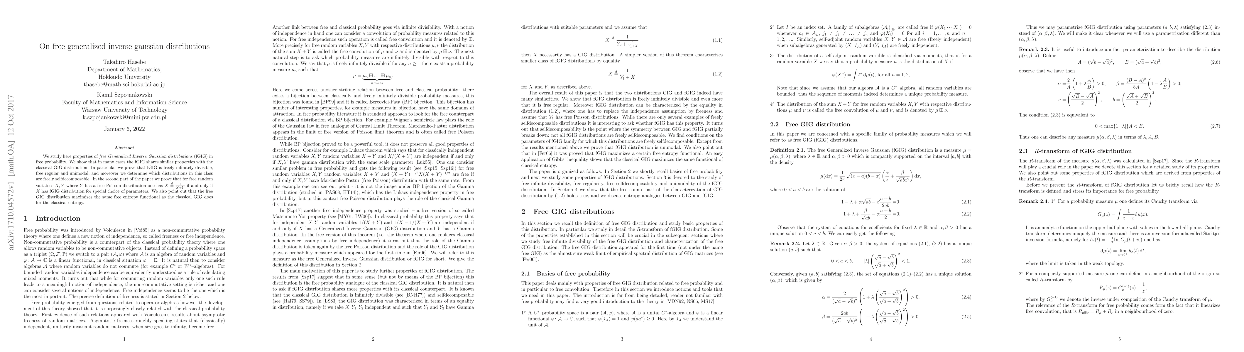 This paper investigates the properties of free Generalized Inverse Gaussian distributions (fGIG), demonstrating their similarities to classical GIG distributions, including free infinite divisibility, free regularity, and unimodality. It also identifies which fGIG distributions are freely selfdecomposable and establishes a relationship between fGIG and free random variables.
