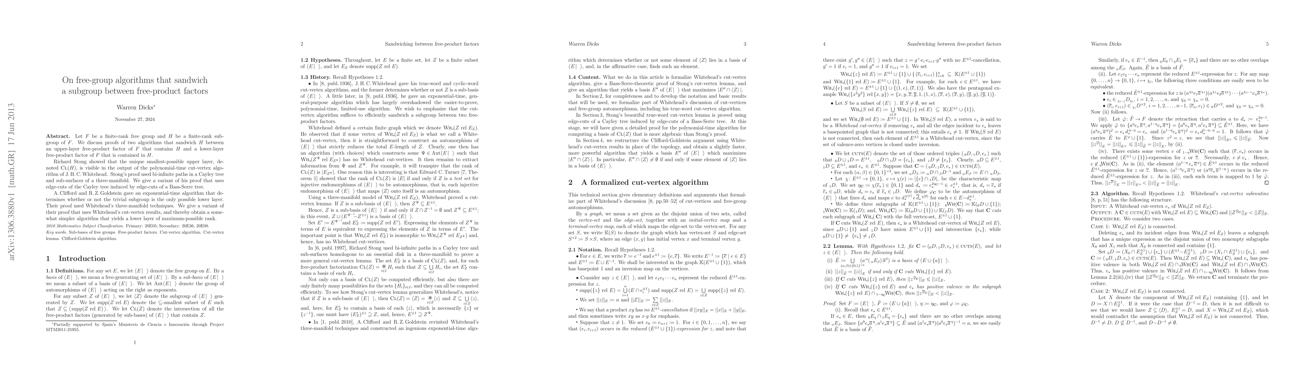 This paper discusses algorithms for sandwiching a subgroup $H$ between upper and lower free-product factors within a finite-rank free group $F$. It presents a variant of Richard Stong's proof for the upper layer using Cayley tree edge-cuts, and a simpler variant for the lower layer using Whitehead's cut-vertex results.