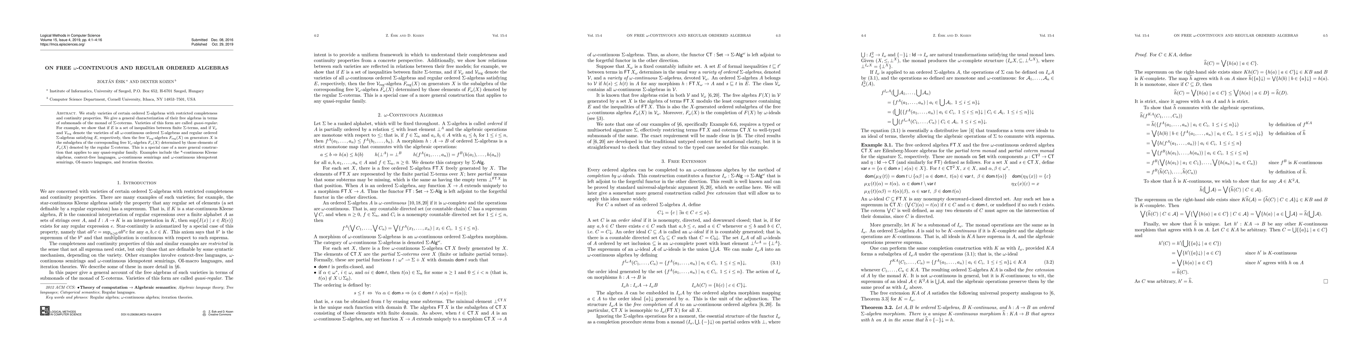 This paper explores varieties of ordered $\Sigma$-algebras with specific completeness and continuity restrictions, providing a characterization of their free algebras via submonads of $\Sigma$-coterms. It demonstrates that free regular ordered algebras are subalgebras of corresponding $\omega$-continuous ordered algebras, exemplified by various algebraic structures including Kleene algebras and context-free languages.