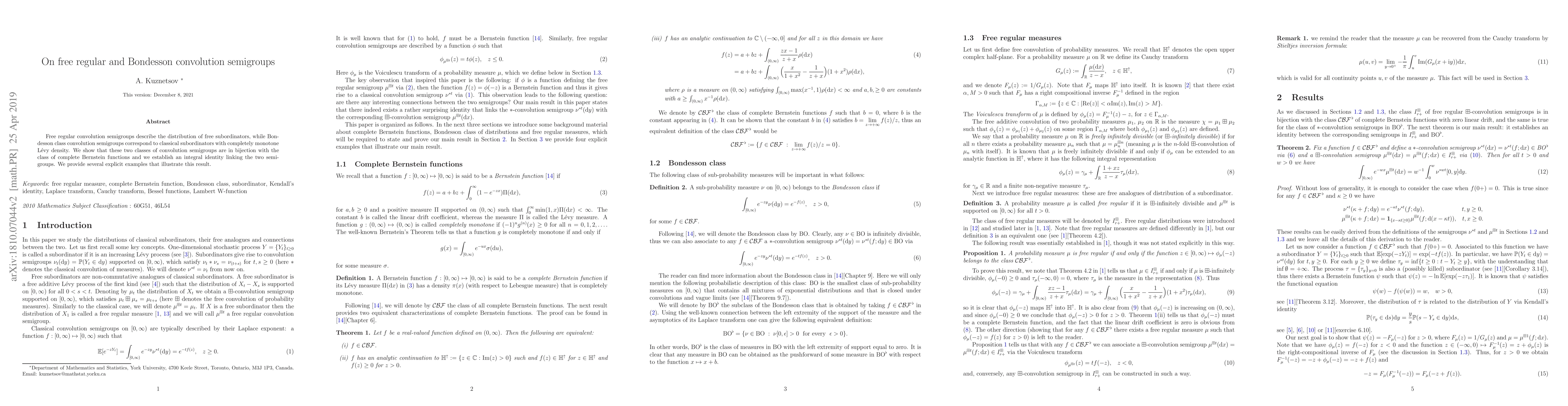 Free regular convolution semigroups describe the distribution of free subortinators, while Bondesson class convolution semigroups correspond to classical subordinators with completely monotone Levy density. We show that these two classes of convolution semigroups are in bijection with the class of complete Bernstein functions and we establish an integral identity linking the two semigroups. We provide several explicit examples that illustrate this result.