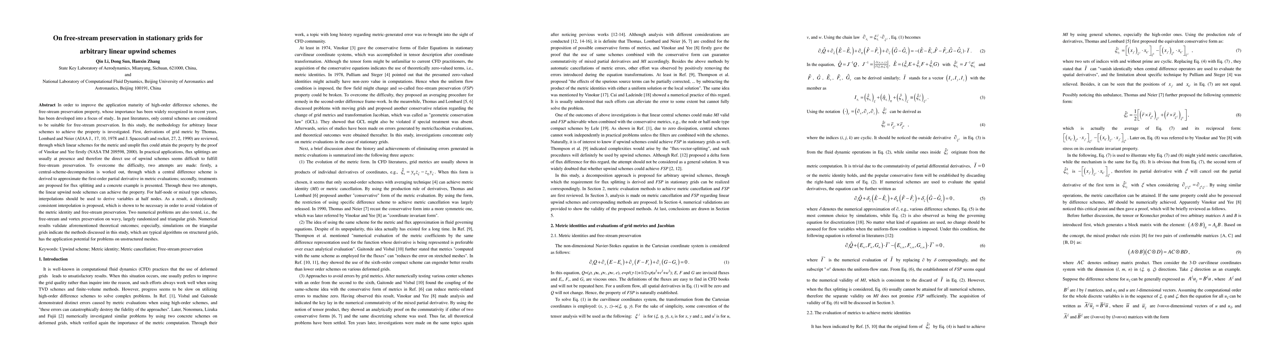 This paper investigates methods to achieve free-stream preservation in arbitrary linear upwind schemes on stationary grids, proposing a central-scheme decomposition and directional interpolation techniques to address flux splitting issues. Numerical tests on various grid types validate the effectiveness of the proposed methods.