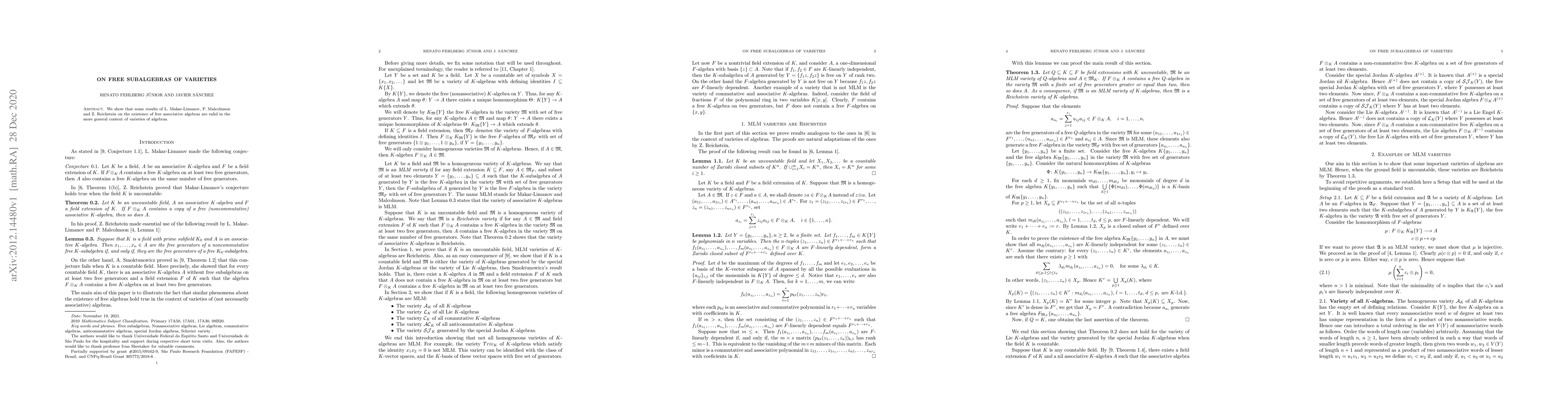 We show that some results of L. Makar-Limanov, P. Malcolmson and Z. Reichstein on the existence of free associative algebras are valid in the more general context of varieties of algebras.