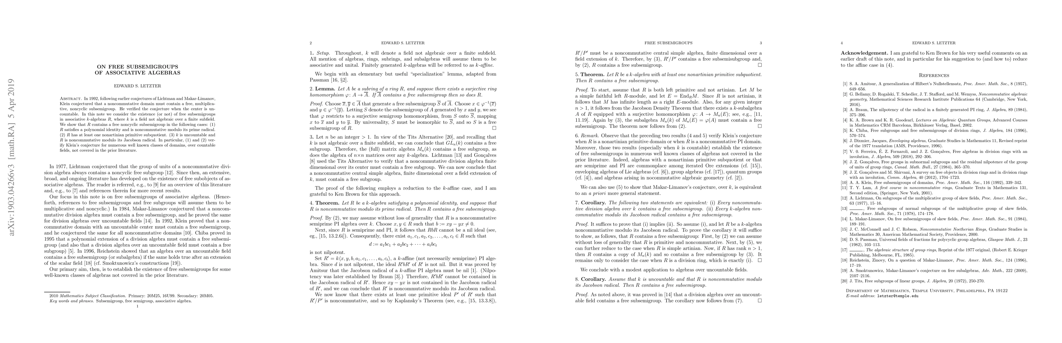 In 1992, following earlier conjectures of Lichtman and Makar-Limanov, Klein conjectured that a noncommutative domain must contain a free, multiplicative, noncyclic subsemigroup. He verified the conjecture when the center is uncountable. In this note we consider the existence (or not) of free subsemigroups in associative $k$-algebras $R$, where $k$ is a field not algebraic over a finite subfield. We show that $R$ contains a free noncyclic subsemigroup in the following cases: (1) $R$ satisfies a polynomial identity and is noncommutative modulo its prime radical. (2) $R$ has at least one nonartinian primitive subquotient. (3) $k$ is uncountable and $R$ is noncommutative modulo its Jacobson radical. In particular, (1) and (2) verify Klein's conjecture for numerous well known classes of domains, over countable fields, not covered in the prior literature.