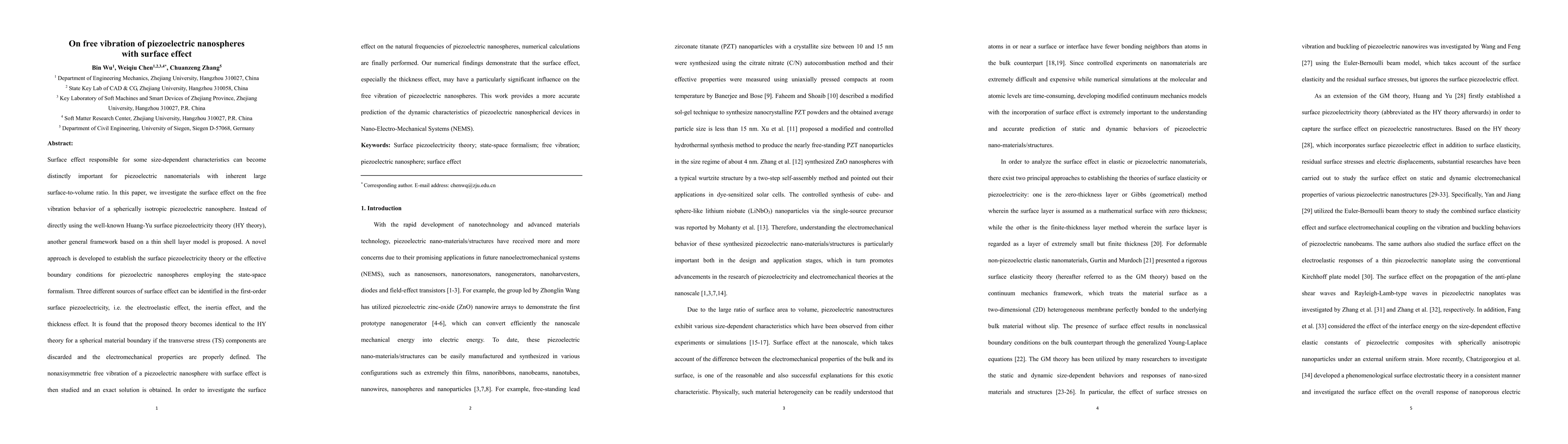 This paper proposes a novel thin shell layer model for investigating the surface effect on the free vibration of piezoelectric nanospheres, identifying three surface effects: electroelastic, inertia, and thickness. The developed theory shows significant influence of the surface effect, especially the thickness effect, on the natural frequencies of piezoelectric nanospheres, providing a more accurate prediction of their dynamic characteristics.