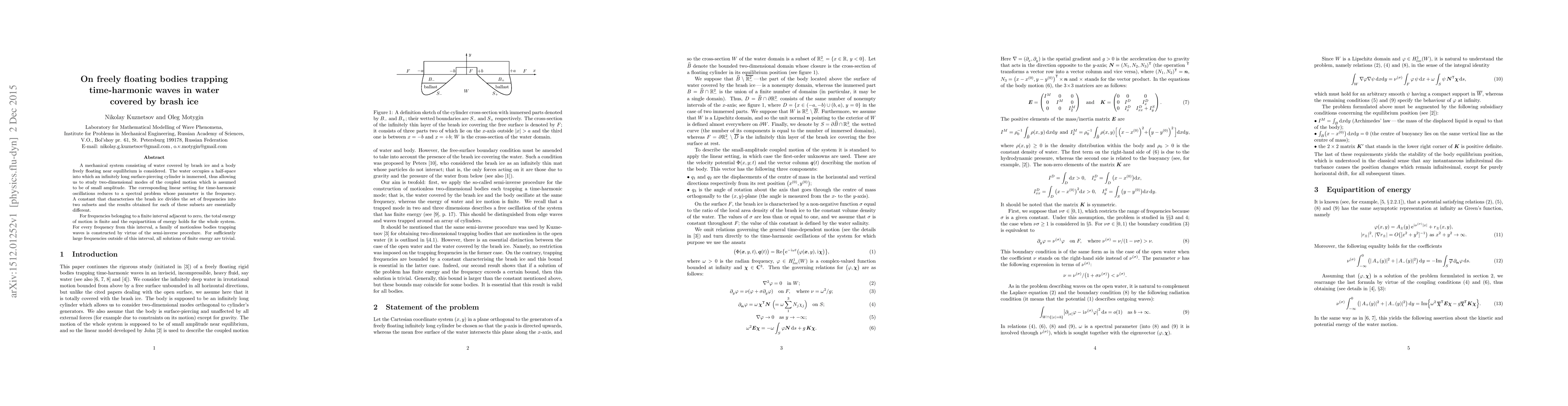 This paper explores the dynamics of a floating body in water covered by brash ice, focusing on time-harmonic wave trapping. It finds that for low frequencies, the system can trap waves, while at higher frequencies, only trivial solutions exist.