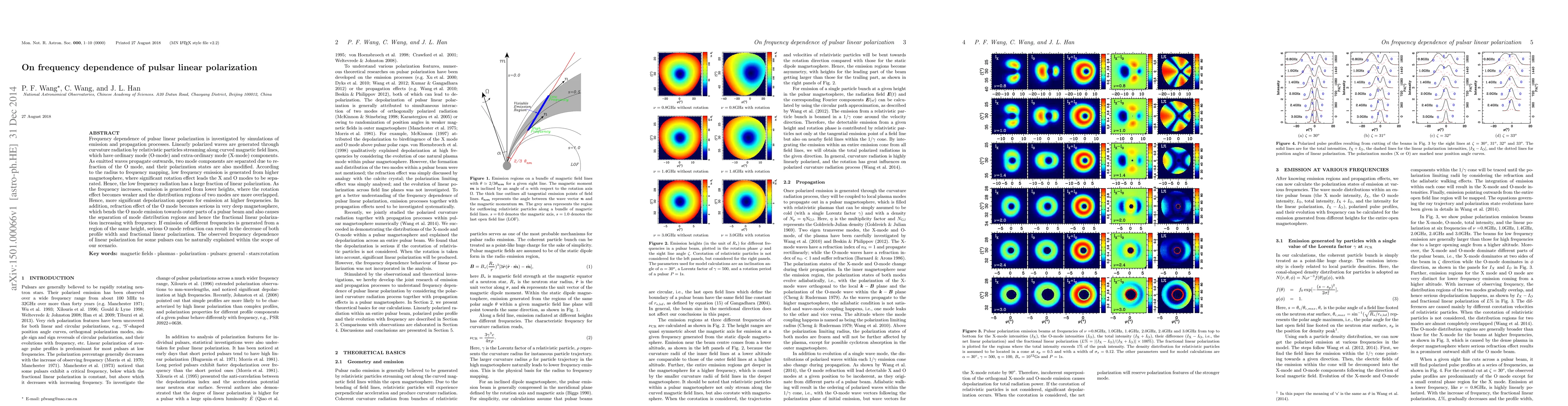 This paper investigates the frequency dependence of pulsar linear polarization through simulations of emission and propagation processes, revealing that low-frequency radiation exhibits higher linear polarization due to significant rotation effects in the higher magnetosphere, while higher frequencies show more depolarization due to weaker rotation effects and overlapping mode distributions.