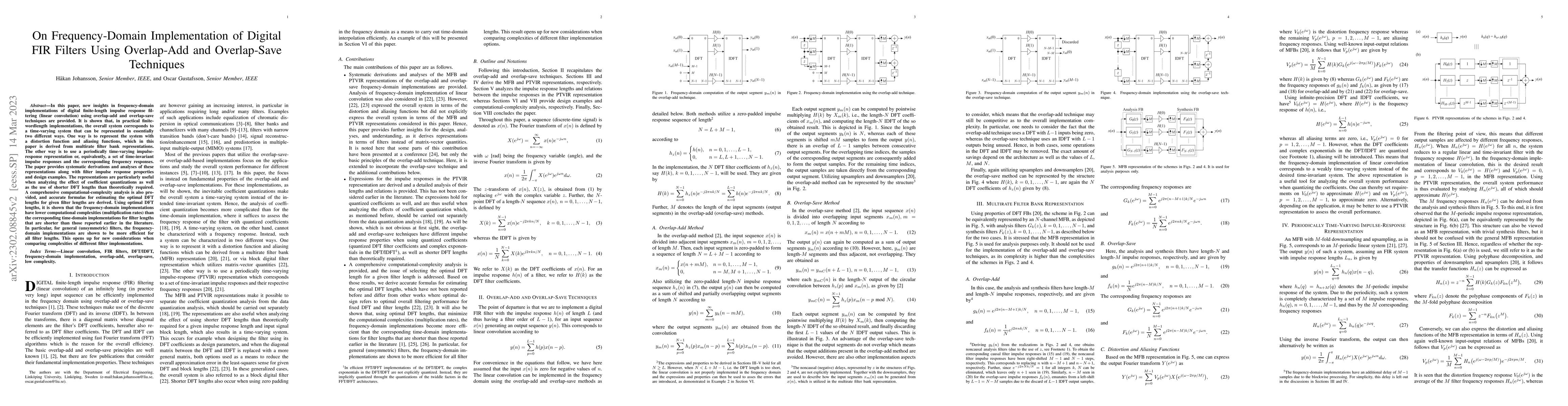 This paper explores frequency-domain implementations of digital FIR filters using overlap-add and overlap-save techniques, showing that practical finite-wordlength systems can be represented in two ways: via distortion and aliasing functions or via periodically time-varying impulse responses. It concludes that frequency-domain implementations are more efficient than time-domain ones for shorter filter lengths.