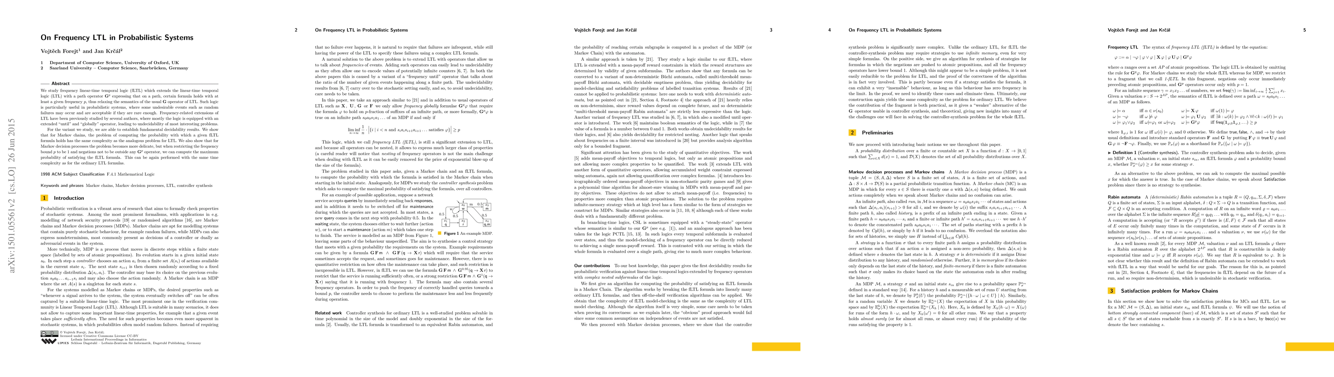 This paper studies frequency linear-time temporal logic (fLTL) for probabilistic systems, establishing decidability results for Markov chains and Markov decision processes with specific restrictions.