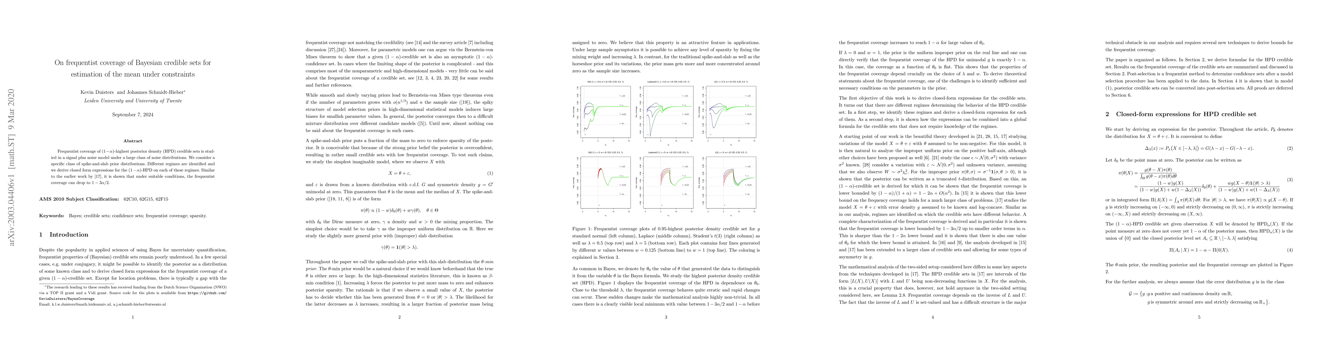 Frequentist coverage of $(1-\alpha)$-highest posterior density (HPD) credible sets is studied in a signal plus noise model under a large class of noise distributions. We consider a specific class of spike-and-slab prior distributions. Different regimes are identified and we derive closed form expressions for the $(1-\alpha)$-HPD on each of these regimes. Similar to the earlier work by Marchand and Strawderman, it is shown that under suitable conditions, the frequentist coverage can drop to $1-3\alpha/2.$